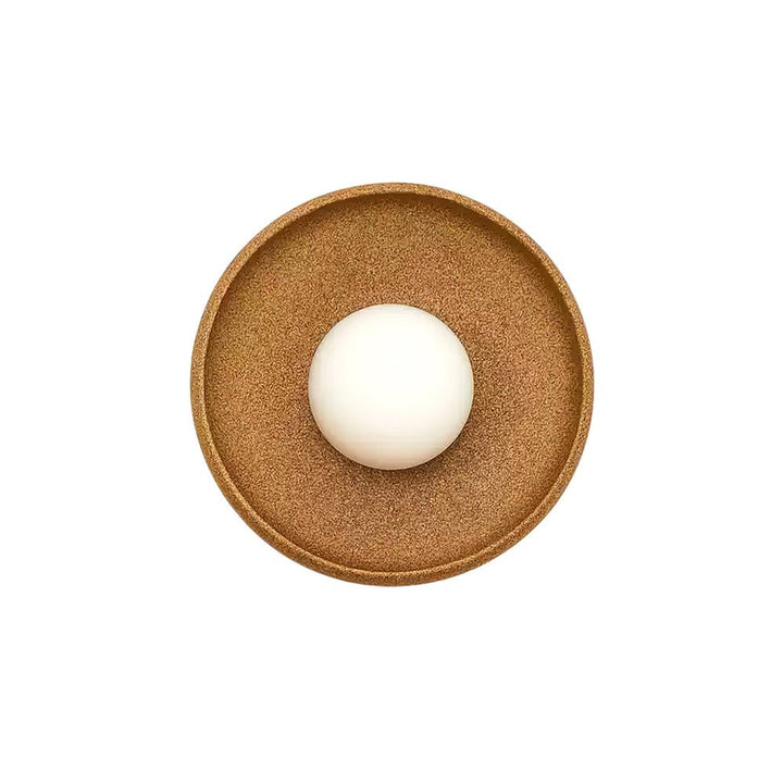 Elevate your living space with the Dusk Round Wall Light. Its minimalist design boasts a deep, textured brown surface and a central white sphere, creating a warm and inviting glow. Perfect for hallways, bedrooms, or living rooms, this lamp seamlessly blends modern simplicity with understated elegance. Transform any room into a tranquil oasis.