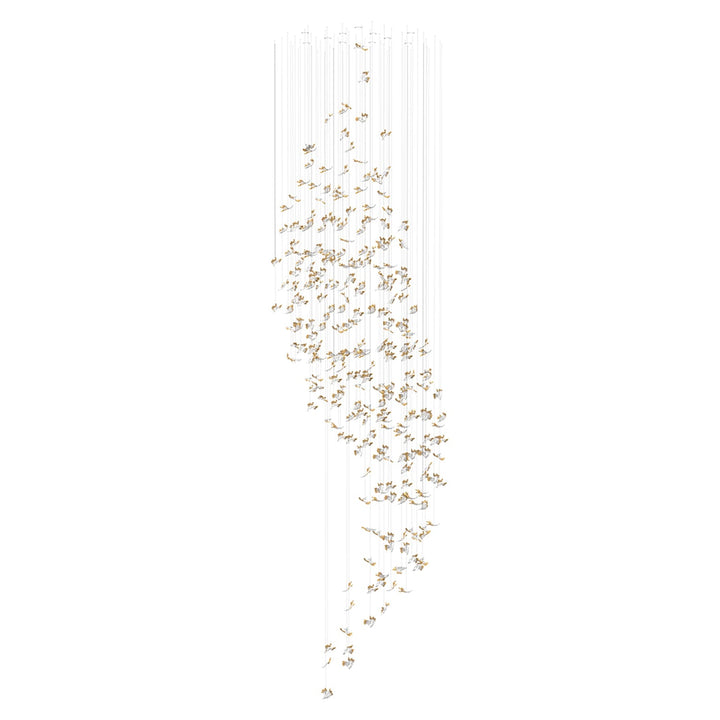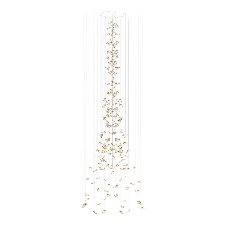 Crystal petals float to the ground like icy snowflakes. A centerpiece fit for snow queen‘s palace, where the delicate and fragile hand-blown pieces glide suspended from the ceiling in various dreamy formations. The delicate artisan crystal glass components embody the fragility of flowers touched by the first frost. The icy effect intensified by adding a color gradient and gilded edges state true luxury.