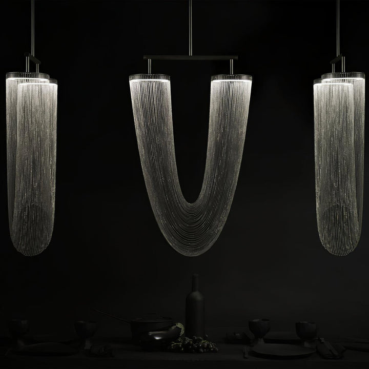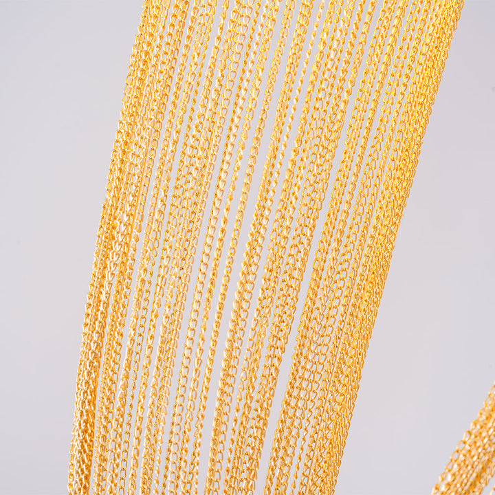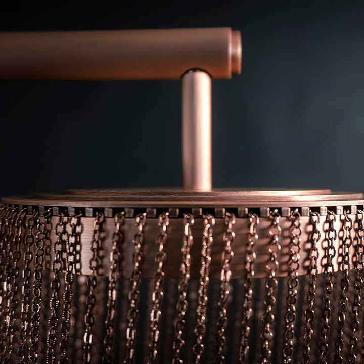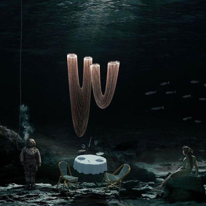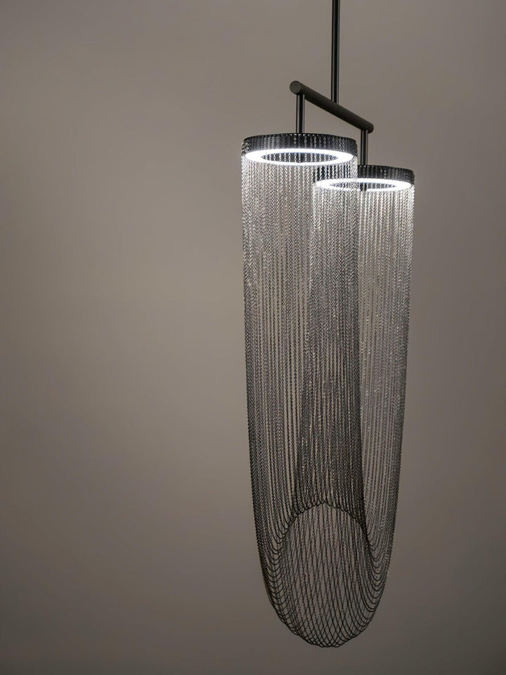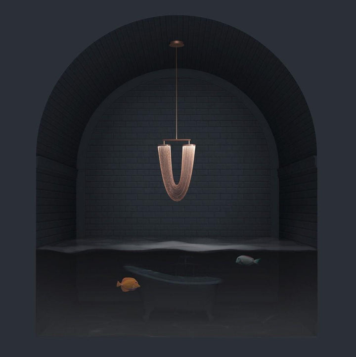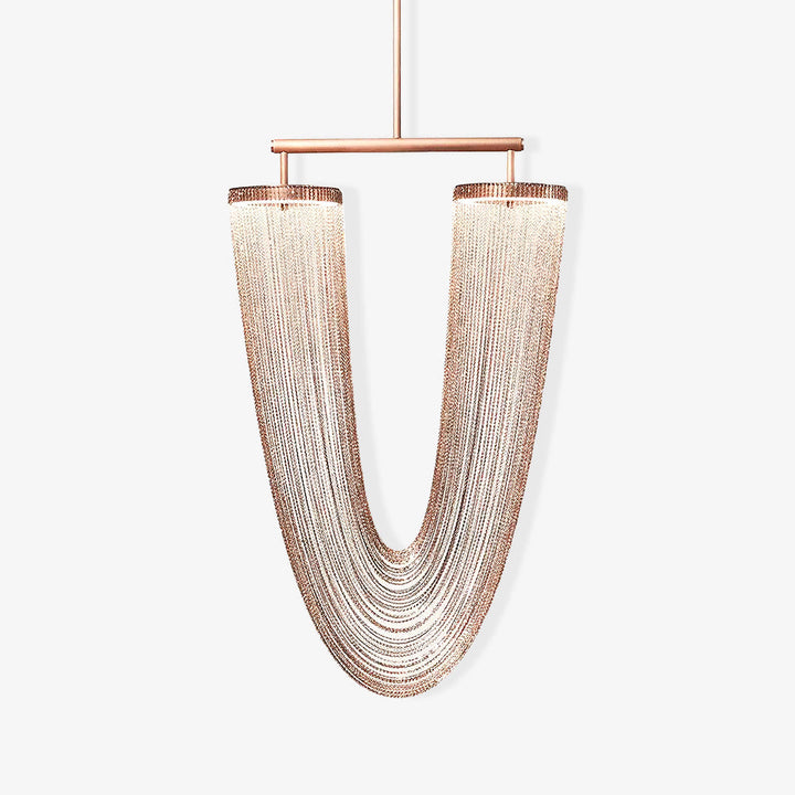 It is with a poetic beauty captured in this luxurious high-end lighting fixture that has been coated with warmth and elegance, that it will infect your daily life. This sculptural light is hand-crafted with delicate copper chains to create a unique and elegant curved shape inspired by the romantic world of jewelry. The light itself comes from two copper rings and goes through the chains to create a magic atmosphere.