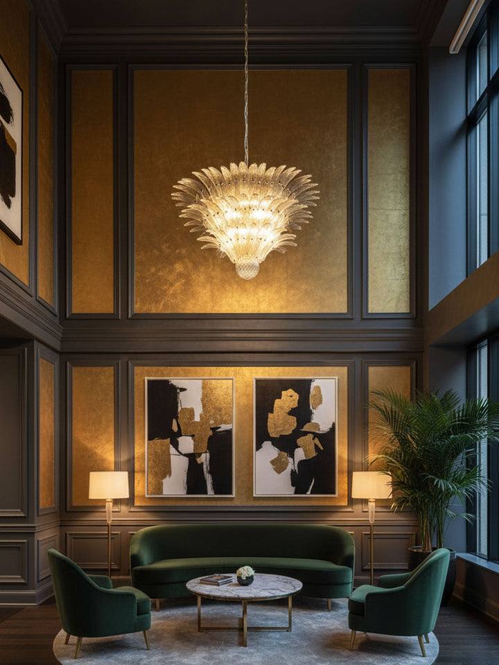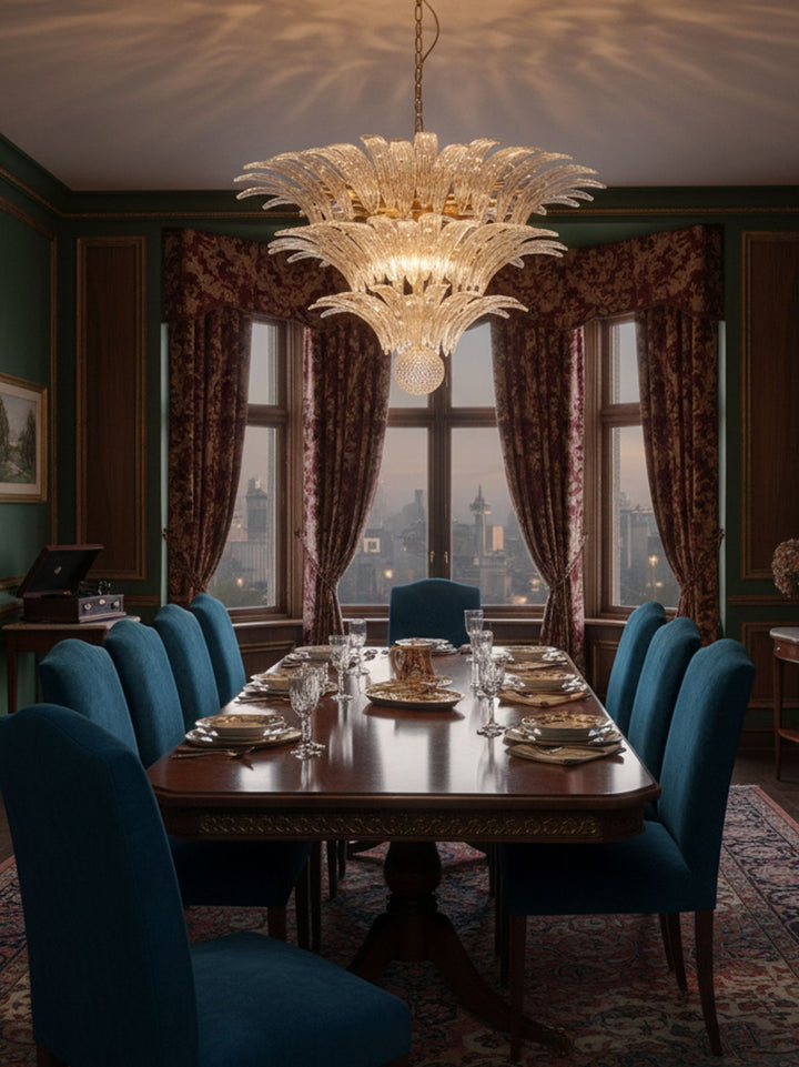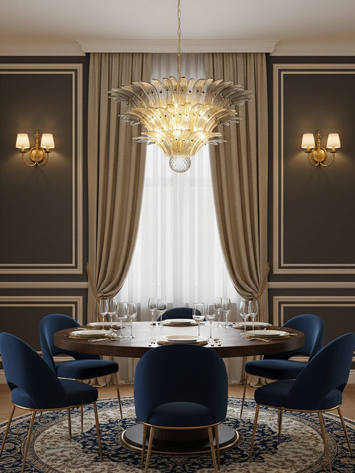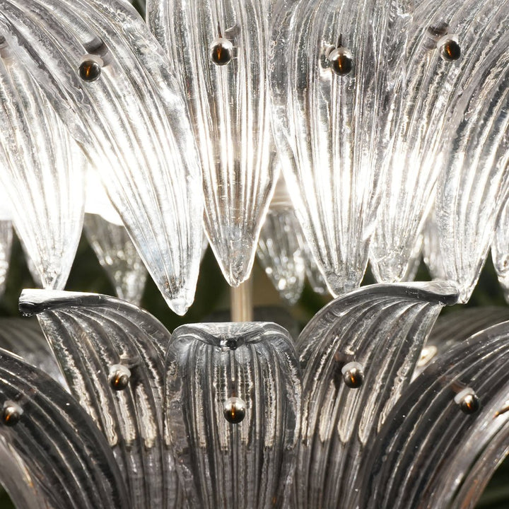 Inspired by the lush elegance of palm leaves, the Palm Grove Murano Chandelier is a masterpiece of craftsmanship and luxury. Featuring hand-blown Murano glass petals arranged in cascading tiers, this statement piece radiates sophistication while casting a warm, ambient glow. Its exquisite detailing and timeless design make it a perfect centerpiece for grand living spaces, upscale dining rooms, and luxury interiors, blending nature's beauty with artisanal excellence.