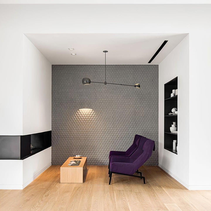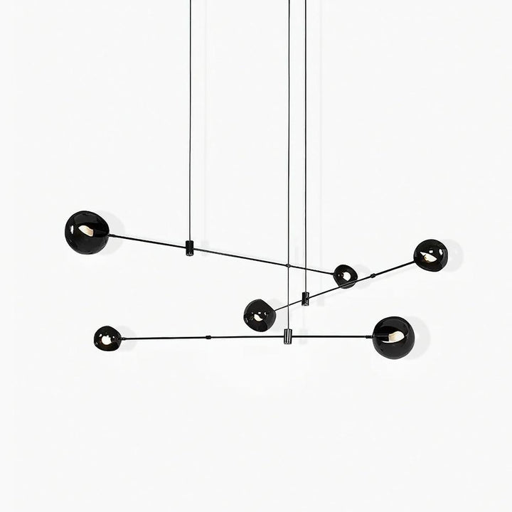 Die Acaba besteht aus zwei unterschiedlich großen Glasschirmen, die an den gegenüberliegenden Enden einer Stahlstange befestigt sind. Jeder Schirm ist durch ein außermittiges Gegengewicht aufgehängt und lässt sich um 320 Grad drehen. Öffnungen an Ober- und Unterseite sorgen für optimale Lichtverteilung. Diese Pendelleuchte eignet sich auch hervorragend für die Installation mehrerer Leuchten.