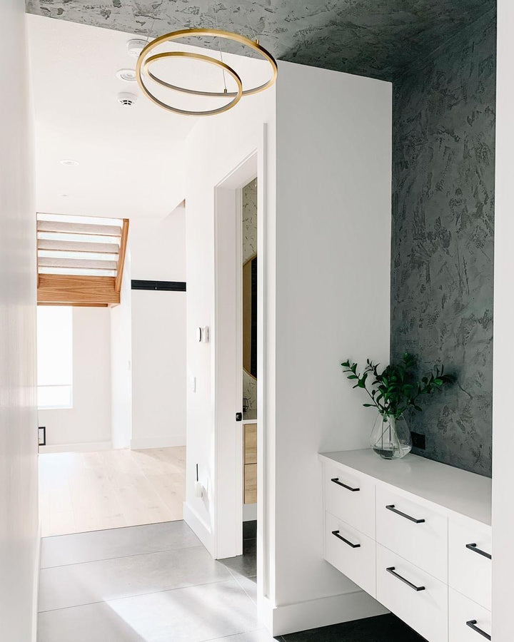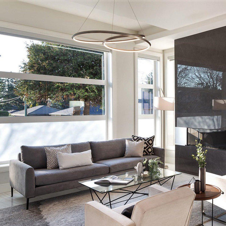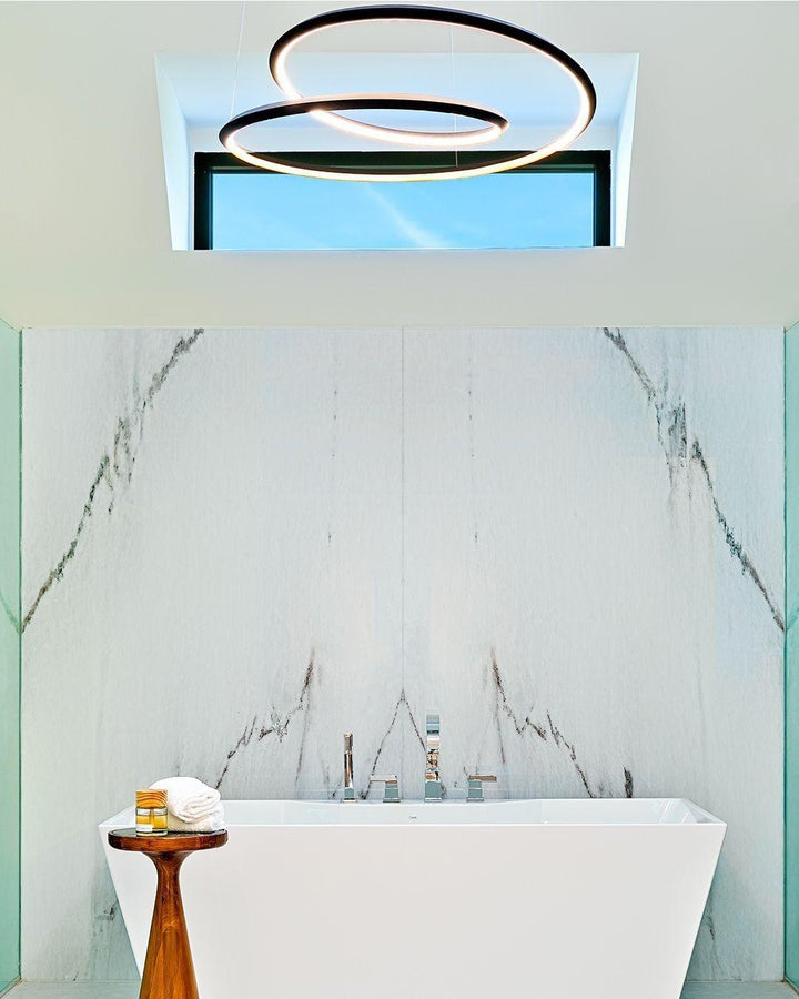 The Ampersand chandelier provides a reductive aesthetic focus but accomplished with a poetic flair. A contemporary eye catching piece that features a Clear round aesthetic glass with Opal diffuser housed by an extruded and rolled triangular aluminum loop.