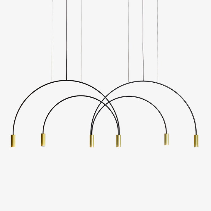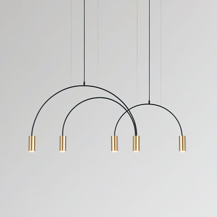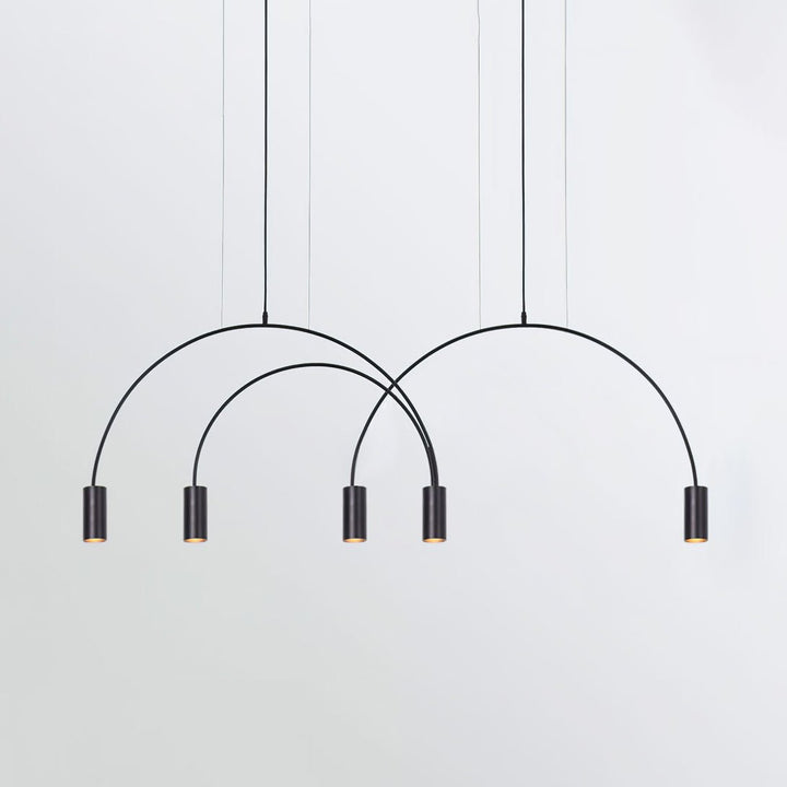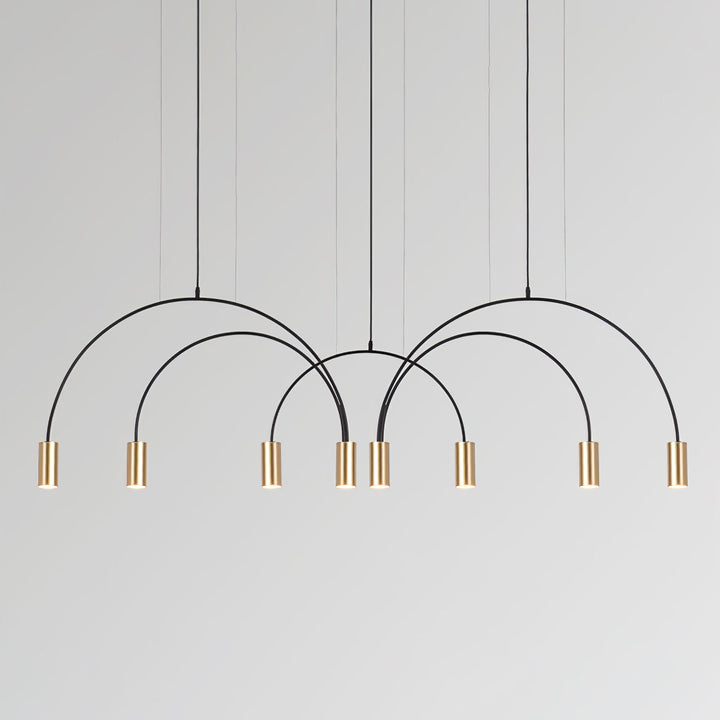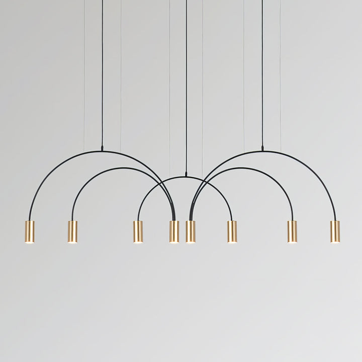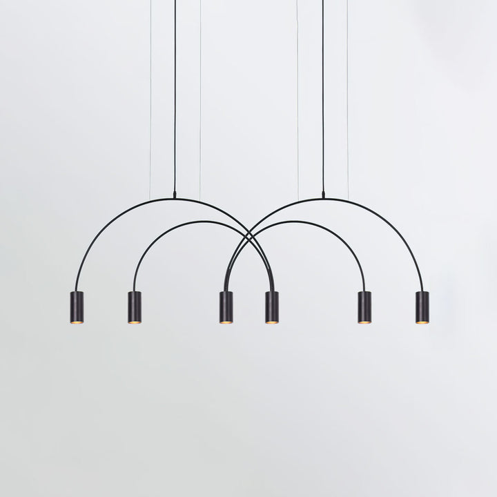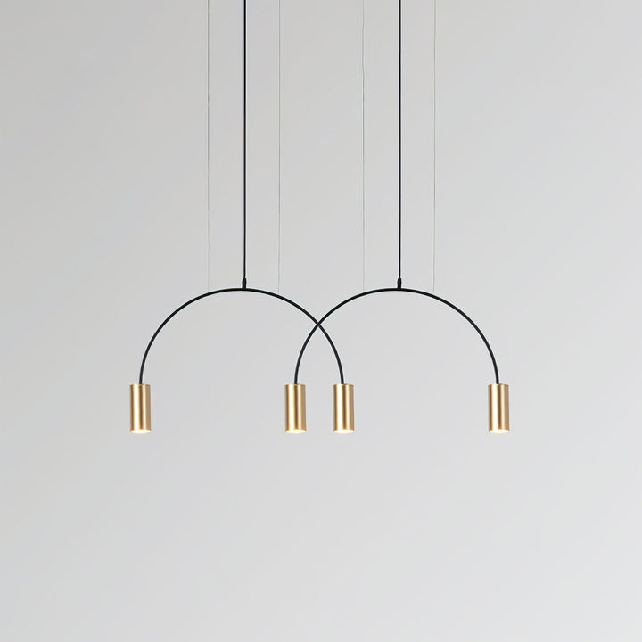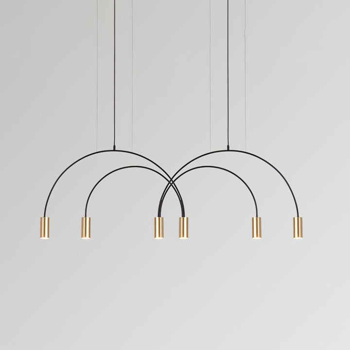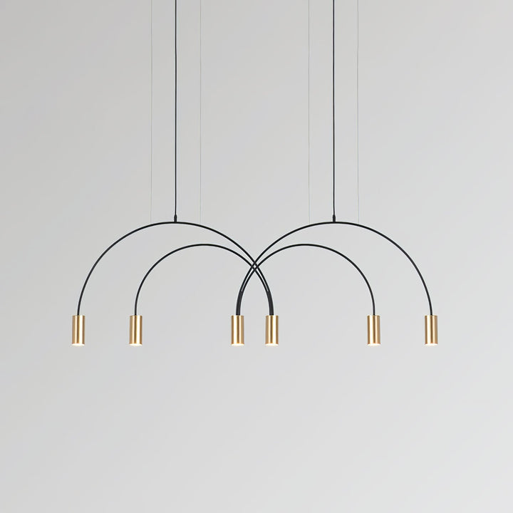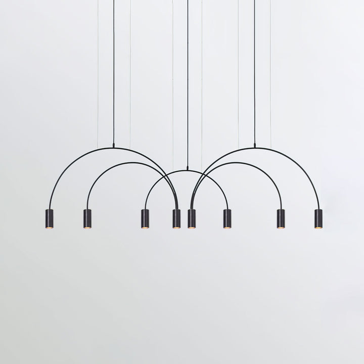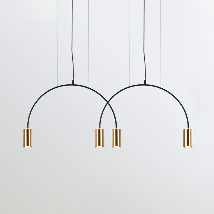 Die Pendelleuchte Arcs besticht durch ihr elegantes, modernes Design mit anmutig überlappenden, geschwungenen Armen in Schwarz, zylindrischen Aluminiumköpfen und Acrylglasdiffusoren. Sie besteht aus zwei großen und zwei kleineren inneren Bögen. Erhältlich in Schwarz oder Gold mit schwarzem oder weißem Baldachin.
