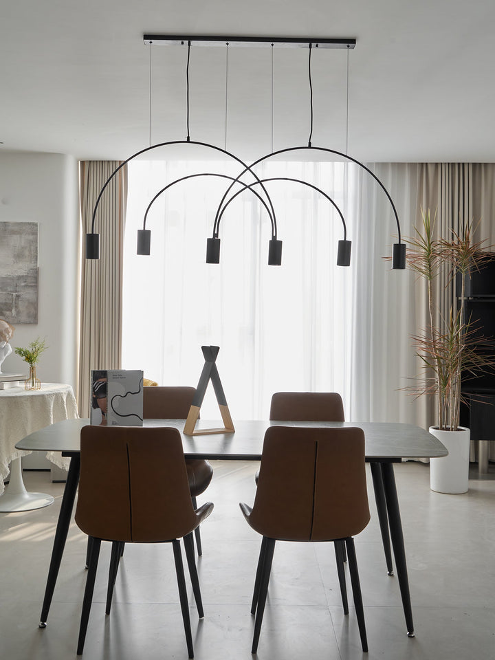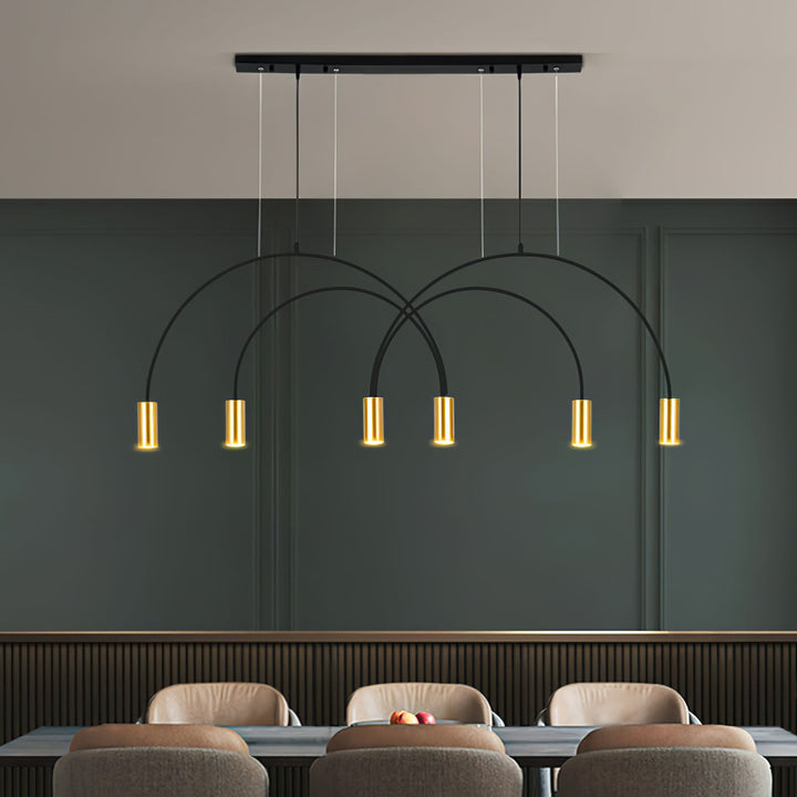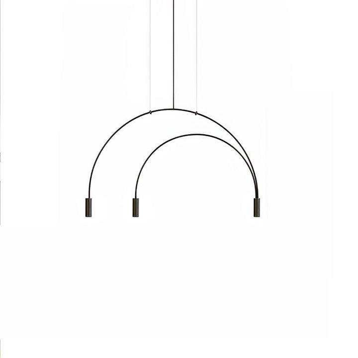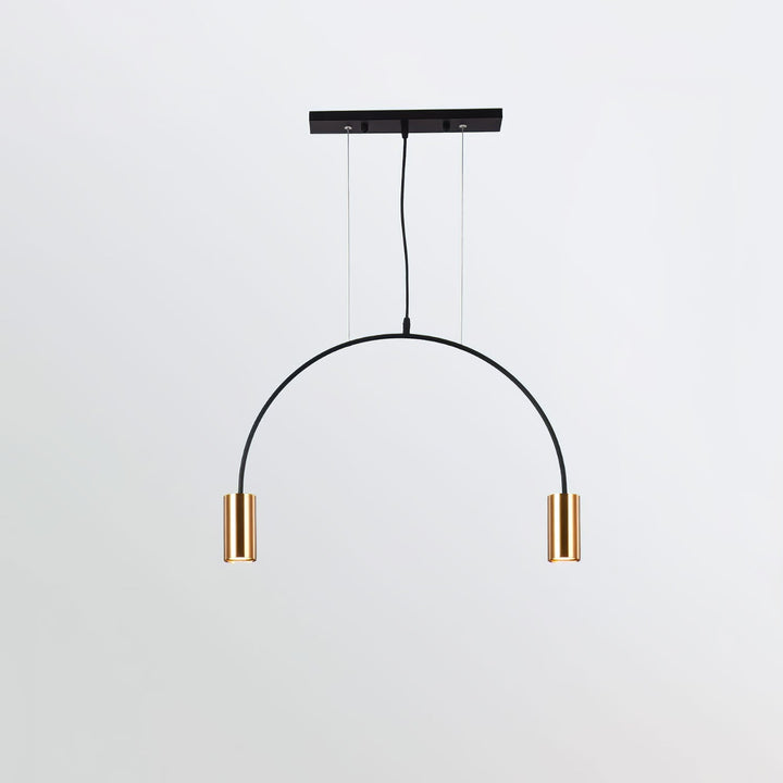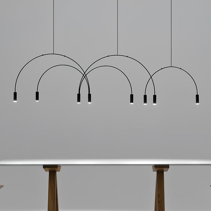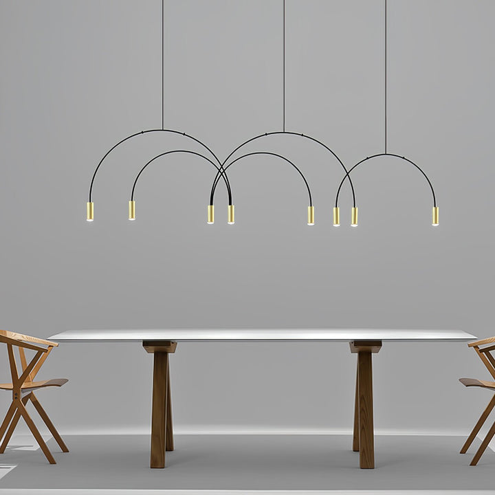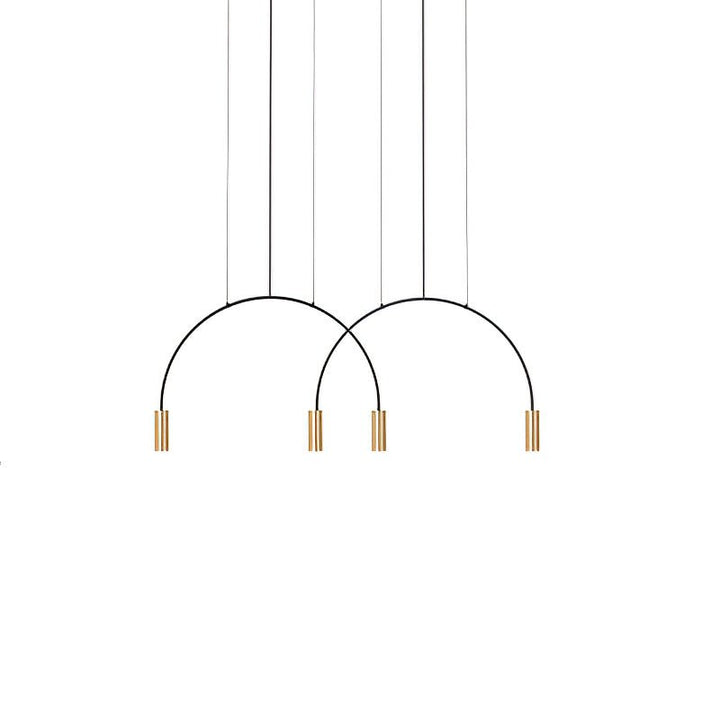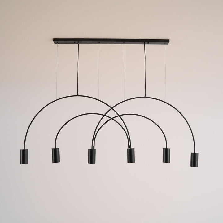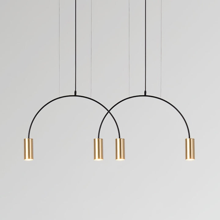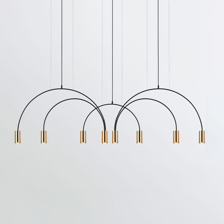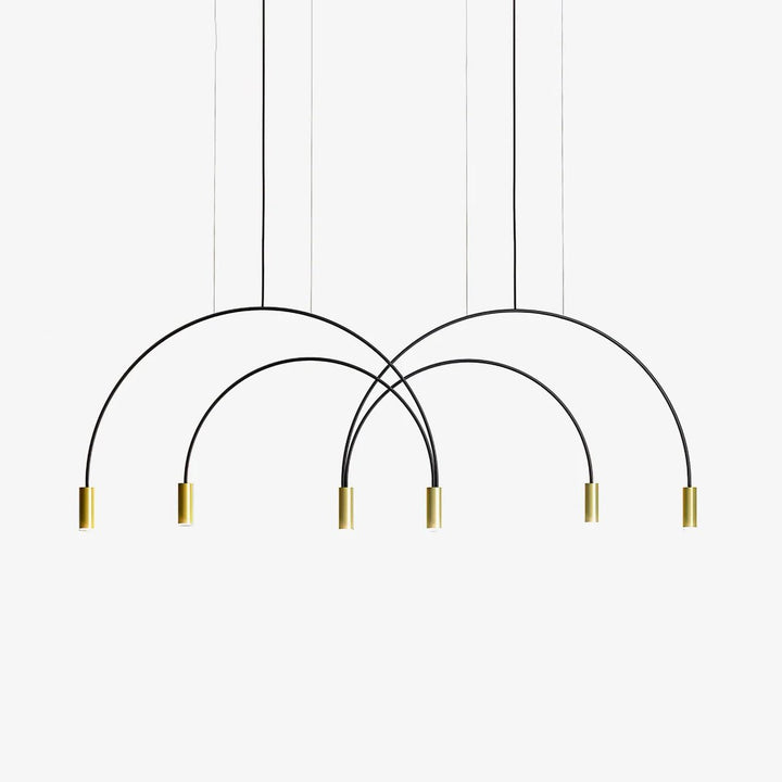 Die Pendelleuchte Arcs besticht durch ihr elegantes, modernes Design mit anmutig überlappenden, geschwungenen Armen in Schwarz, zylindrischen Aluminiumköpfen und Acrylglasdiffusoren. Sie besteht aus zwei großen und zwei kleineren inneren Bögen. Erhältlich in Schwarz oder Gold mit schwarzem oder weißem Baldachin.