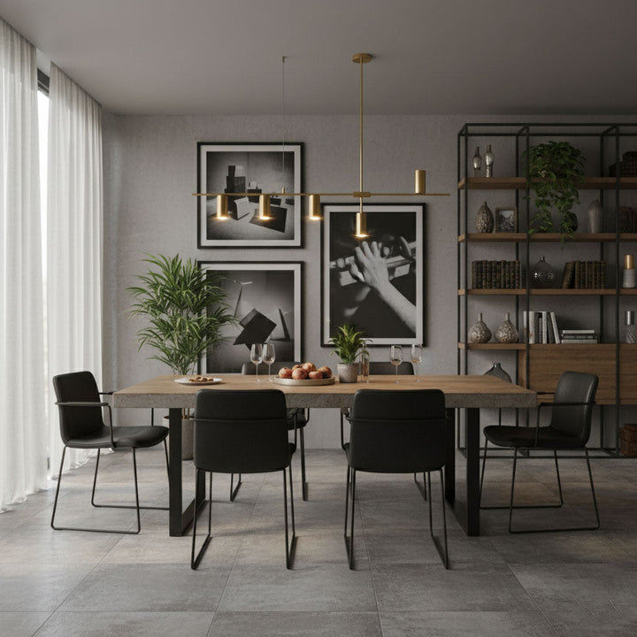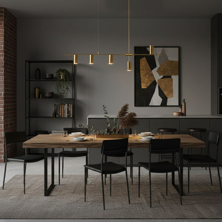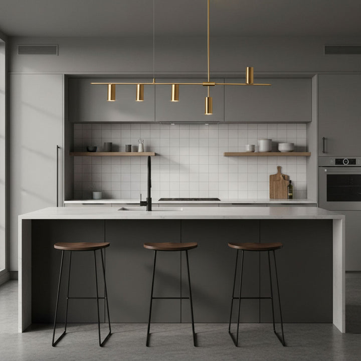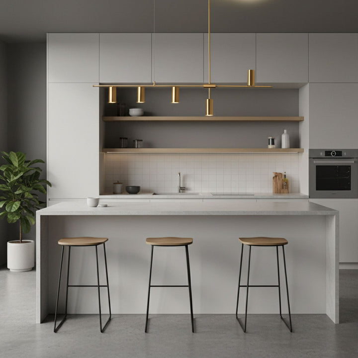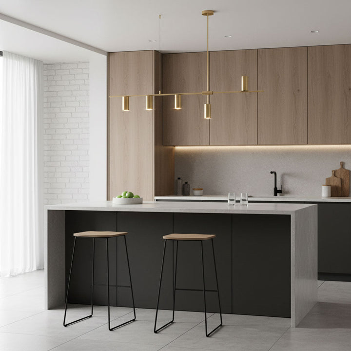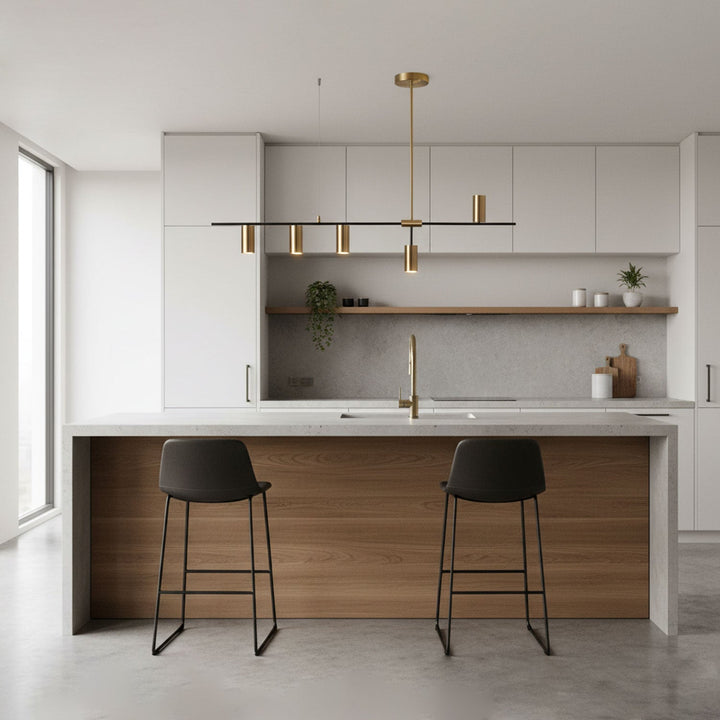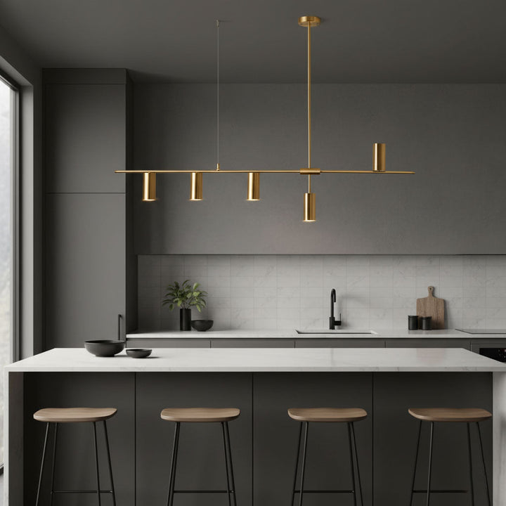 Elevate your dining or kitchen space with the modern elegance of the Cassandra Linear Pendant Lamp. This sleek, minimalist fixture boasts a striking combination of brushed gold metalwork and a streamlined black frame, creating a sophisticated balance that complements any contemporary interior. The adjustable pendant design allows you to customize the height, making it perfect for over kitchen islands or dining tables. With its clean lines and refined aesthetic, the Cassandra lamp adds both functionality and a sense of luxury to your home. Let this statement piece be the highlight of your modern living space!