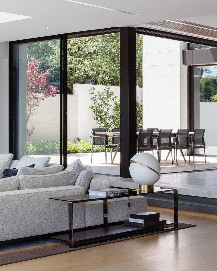 Diese Miniaturversion der beliebten Crescent Light ist eine beleuchtete Kugel, die asymmetrisch halbiert ist und so eine halbmondförmige Front aus gebürstetem Messing freigibt. Der Designer vereint gekonnt Massives und Opakes.