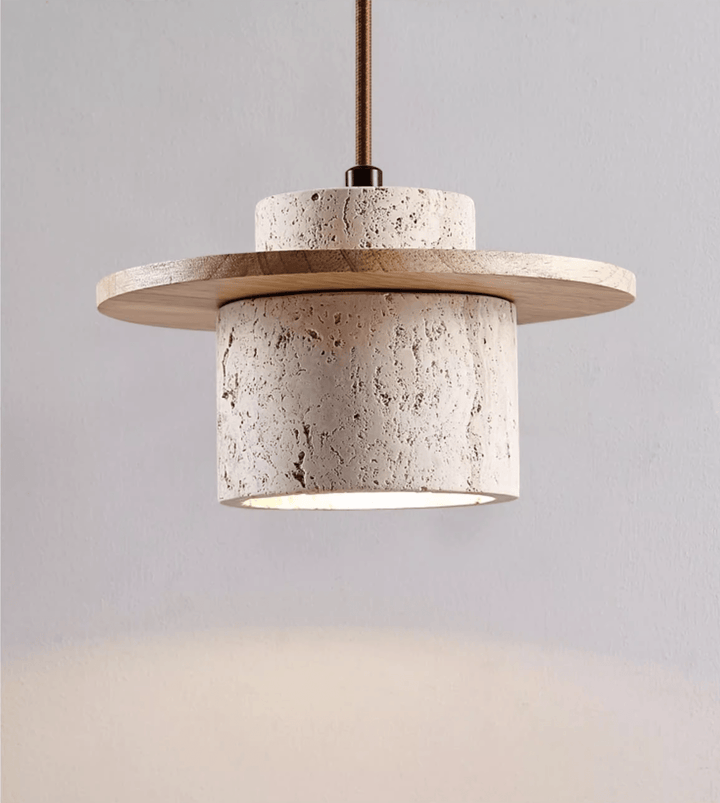 Entdecken Sie die Vakkerlight Cylindrical Stone Wandleuchte – eine wunderschöne, minimalistische Wandleuchte, die natürliche Texturen mit modernem Design verbindet. Sie verfügt über eine robuste Wandhalterung aus Walnussholz und einen eleganten, dunklen Metallarm, der einen einzigartigen zylindrischen Schirm trägt. Der Schirm selbst ist aus strukturiertem, natürlichem gelbem Travertin gefertigt und wird von einer kontrastierenden Holzscheibe elegant gekrönt. Die Leuchte spendet ein sanftes, fokussiertes Licht nach unten und verleiht Räumen mit ihrem organischen, handwerklichen Charme eine angenehme Atmosphäre – ideal für moderne und rustikal-schicke Interieurs.