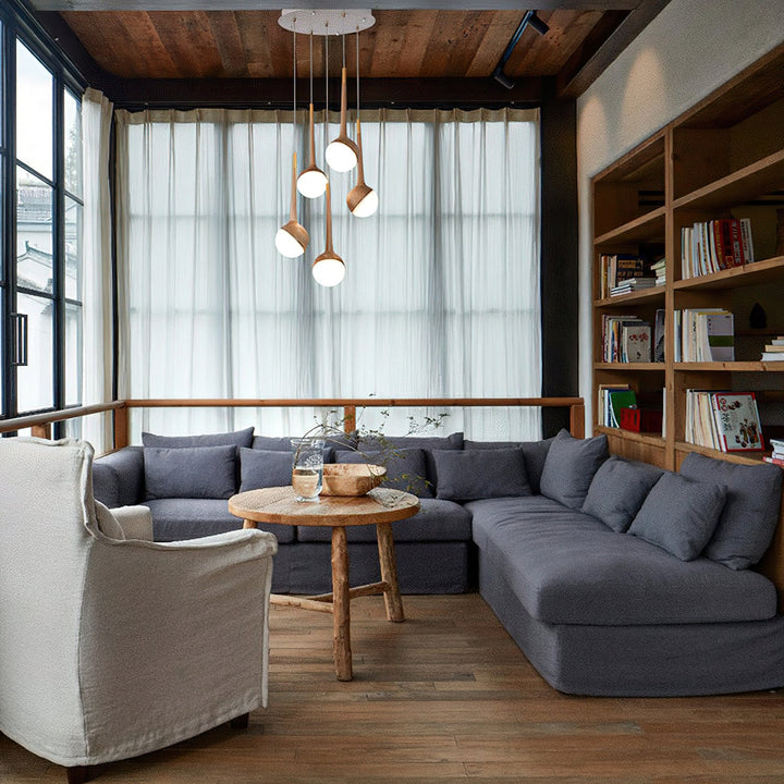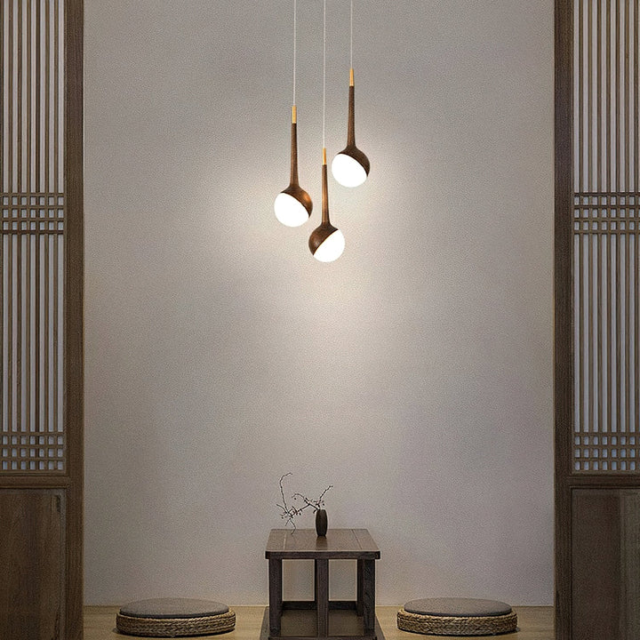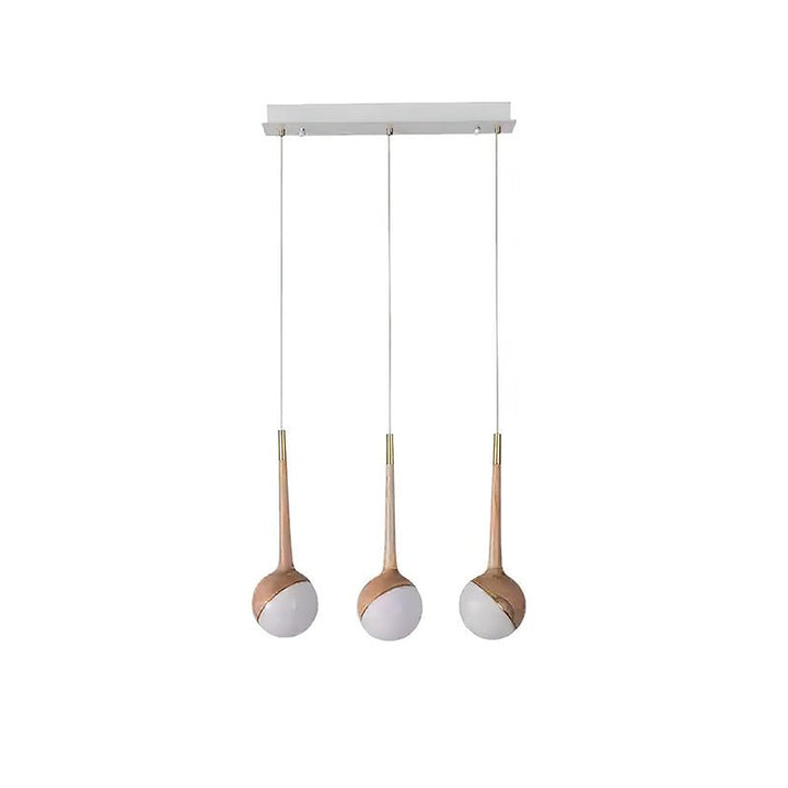 The Water Droplet Chandelier is a stylish and modern lighting fixture inspired by the natural elegance of a water drop suspended in mid-air. Each pendant light features a beautifully crafted wooden stem that tapers gracefully into a rounded, creamy white acrylic shade, resembling a water drop about to fall. The smooth transition between wood and acrylic creates a harmonious blend of materials, while the soft, diffused light creates a warm and inviting ambience.