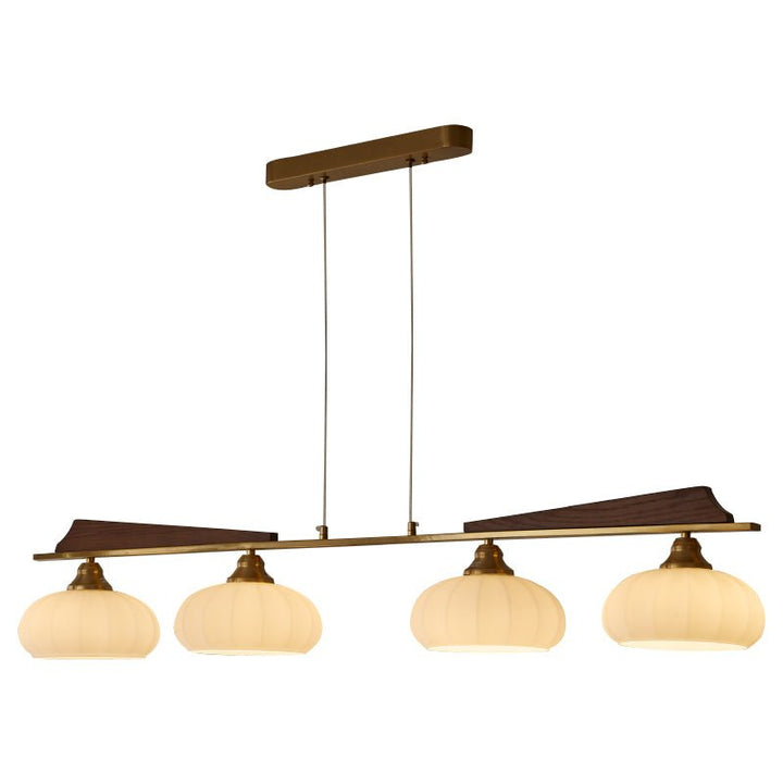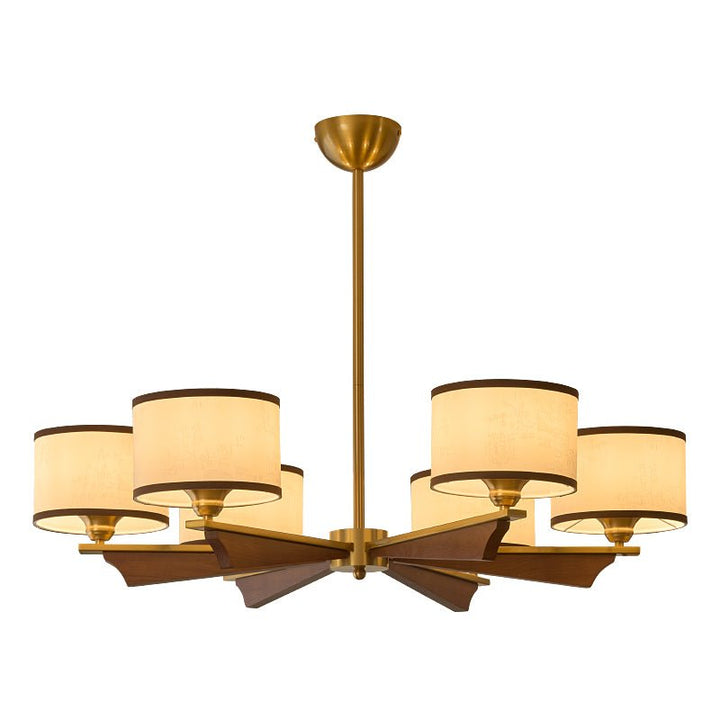 Unfold the mid-century charm of the Elara Bloom Chandelier, an exquisite lighting statement from Vakkerlight. This captivating fixture features a central brass stem from which six luminous, pleated glass shades gracefully emerge, reminiscent of delicate flower blossoms. Below, a striking arrangement of rich, dark wooden blades extends outwards, adding a dramatic architectural contrast and a touch of sophisticated warmth. Named 'Elara'—evoking celestial beauty and grace—this chandelier casts a soft, ambient glow, making it a perfect centerpiece for dining rooms, living spaces, or entryways seeking a blend of vintage allure and timeless elegance.