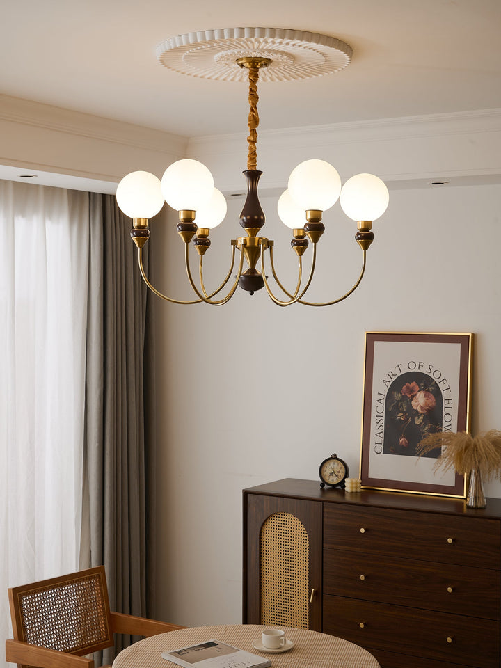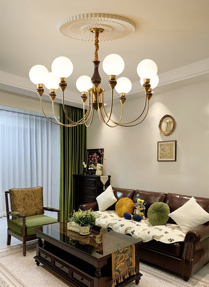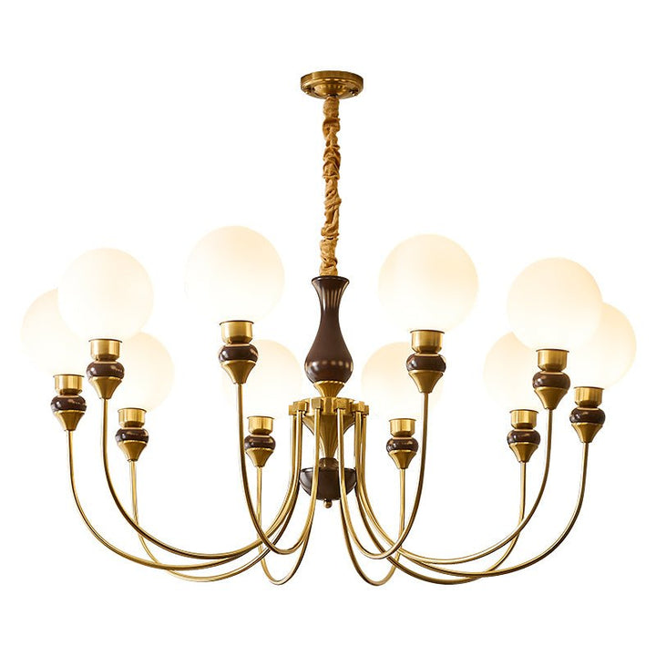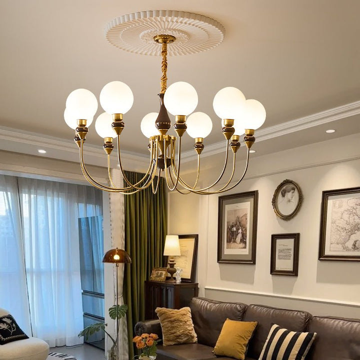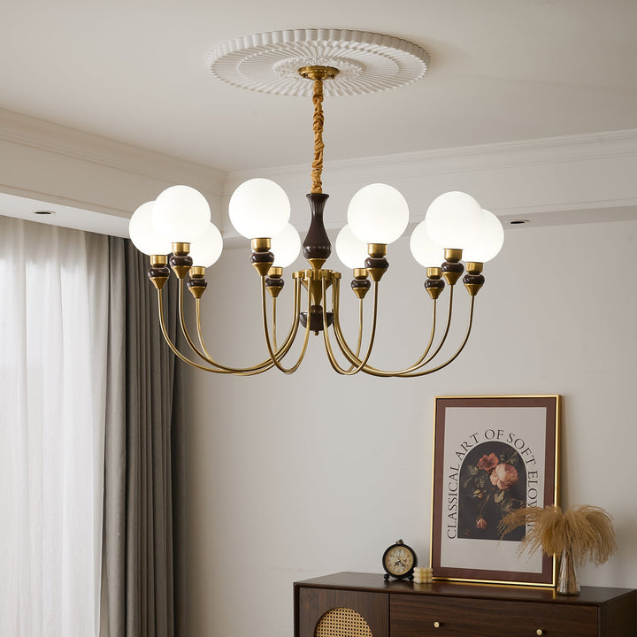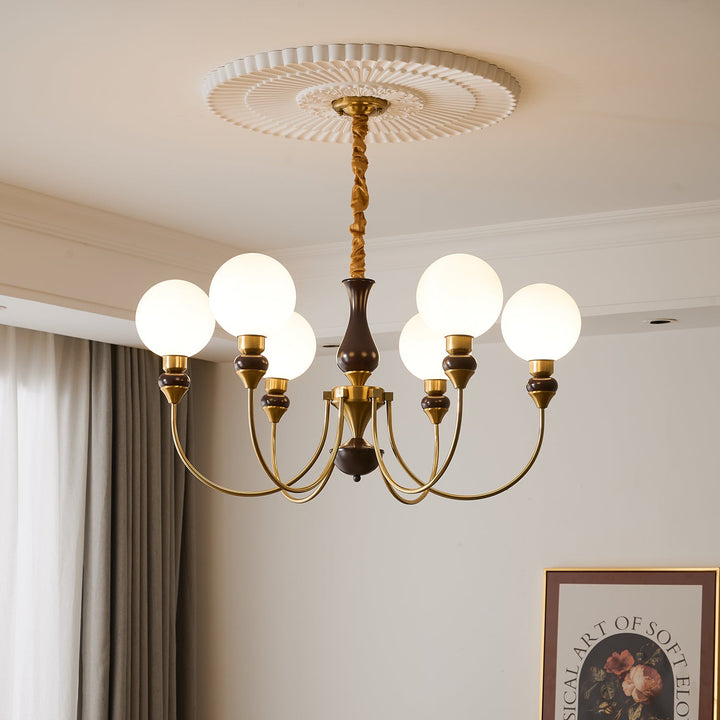 The Helena Curve Chandelier by Vakkerlight features gracefully arched brass arms, walnut accents, and frosted glass globes. This striking yet elegant design creates a harmonious blend of modern and classic elements, illuminating your space with timeless sophistication.