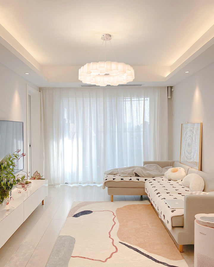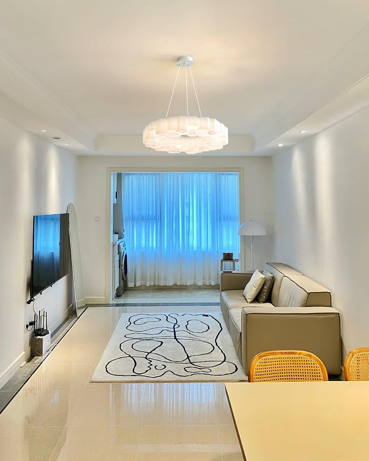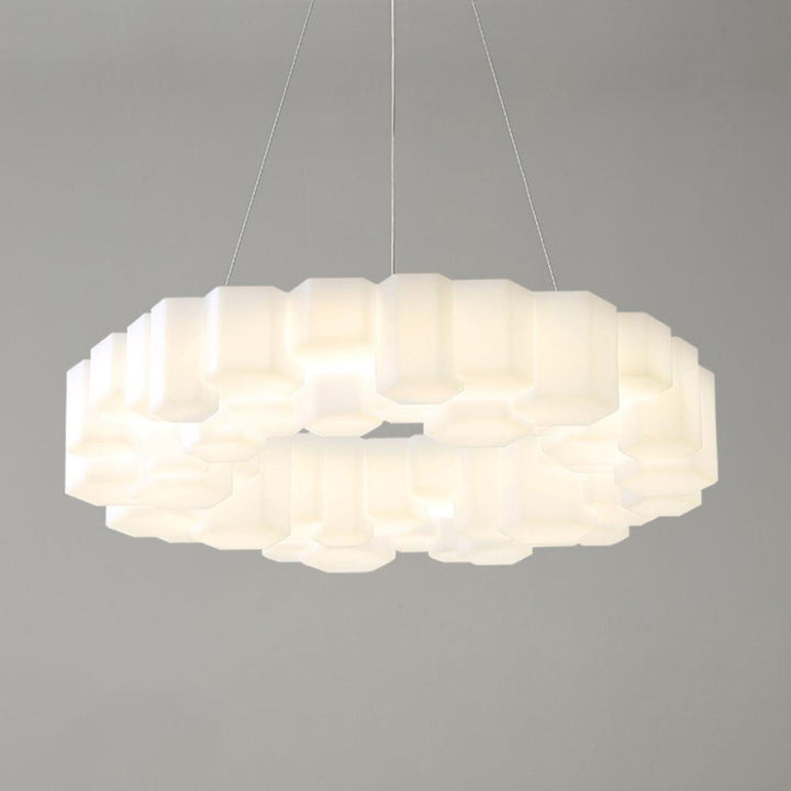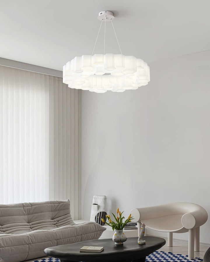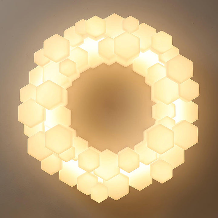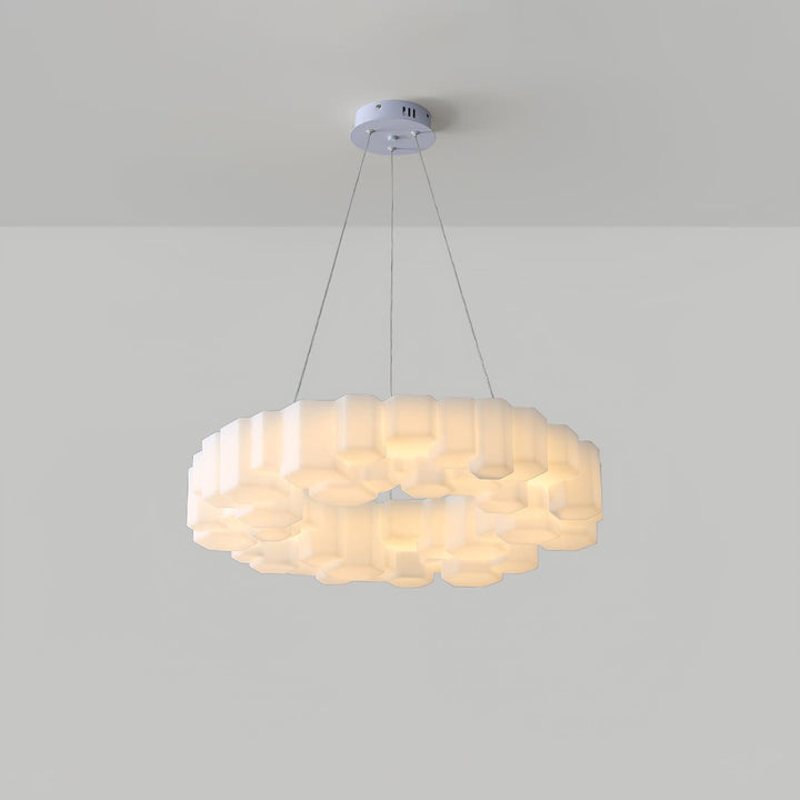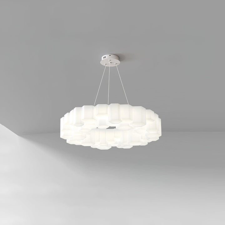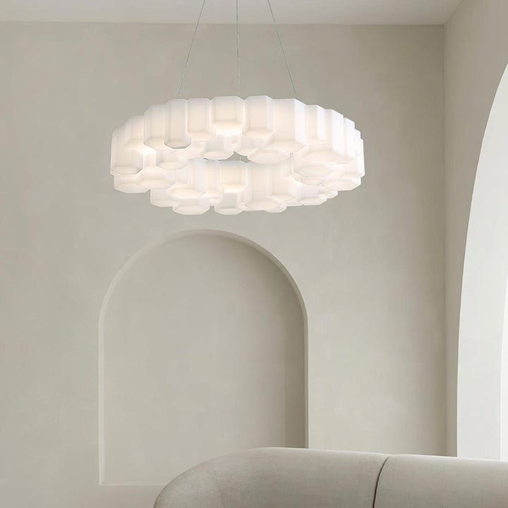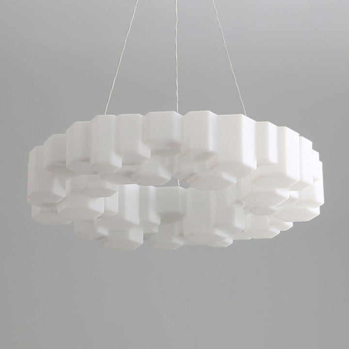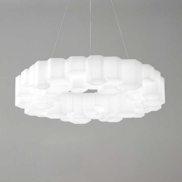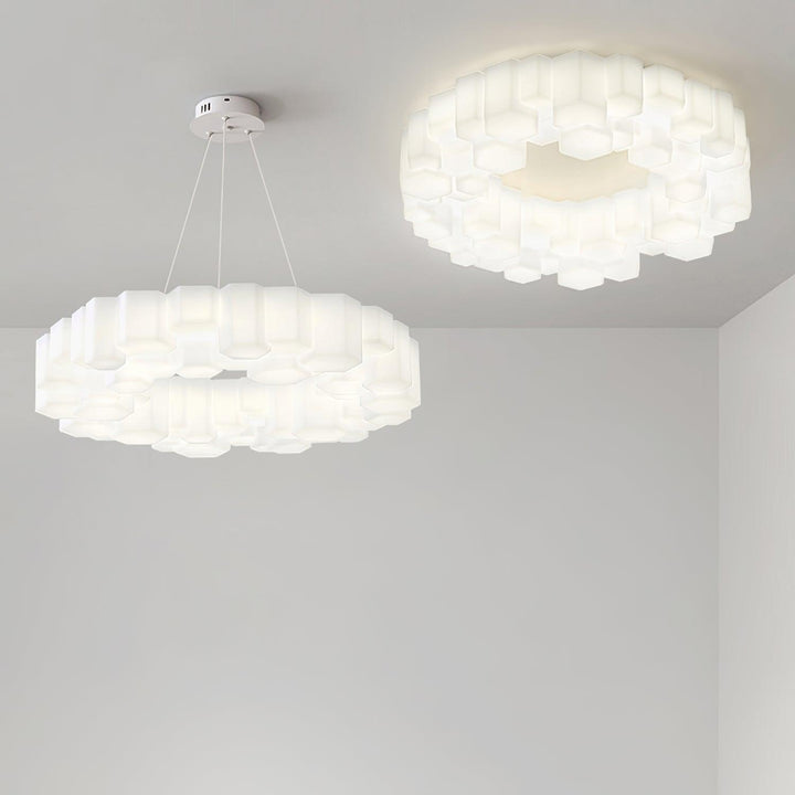 Die Lampen bestehen aus Modulen aus glänzend weißem Polycarbonat, einem glasähnlichen und robusten Material. Ihr Design erinnert an das sechseckige Muster einer Honigwabe. Die Pendelleuchten spenden ein warmes und angenehmes Licht.