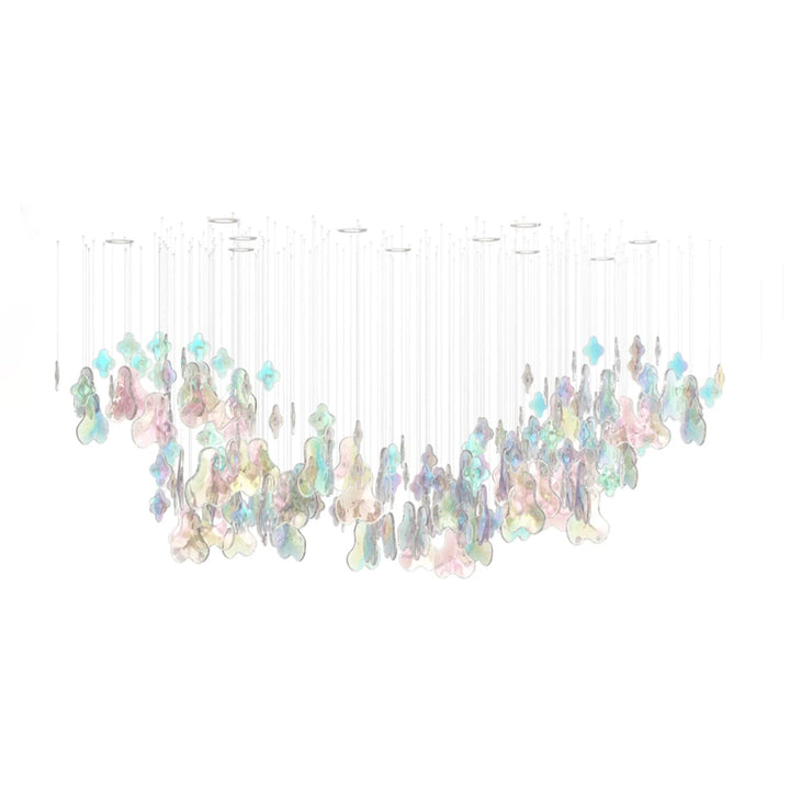 The Iris Iridescent Blossom Chandelier draws inspiration from the natural beauty of irisation, capturing the fleeting charm of rainbow clouds. Its organic form mirrors the irregular shapes of clouds, while the surface reflects gentle pastel hues that shift with light. This chandelier infuses any space with a harmonious blend of vibrant and soothing colors, creating an atmosphere that stimulates imagination and uplifts mood. Combining a unique design with delicate tones, it offers both serene calmness and dynamic energy, making it a refined centerpiece for sophisticated interiors.