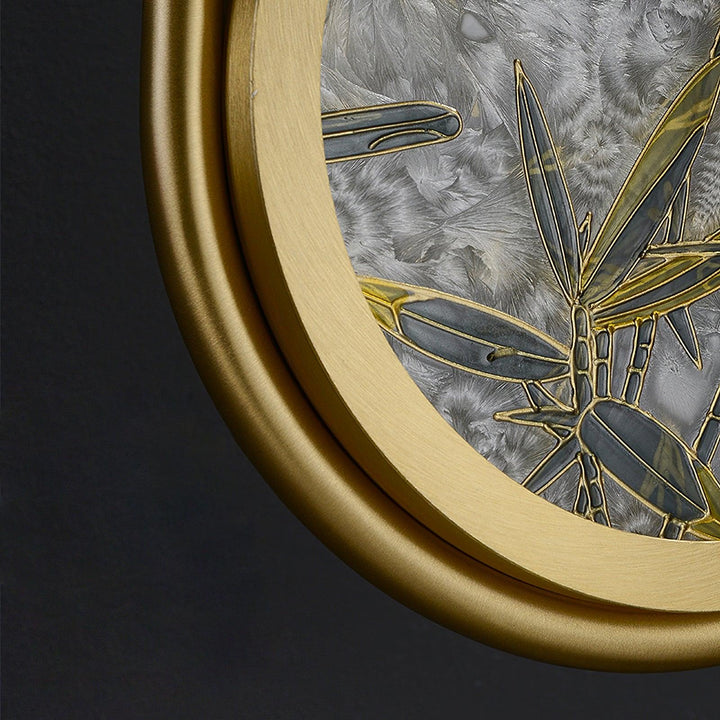 Die Wandleuchte Jervis zeichnet sich durch einen hängenden Messingring mit den Maserungsmustern einer emaillierten Glasscheibe aus, wodurch ein Gefühl von Luxus mit Funktionalität verbunden wird.