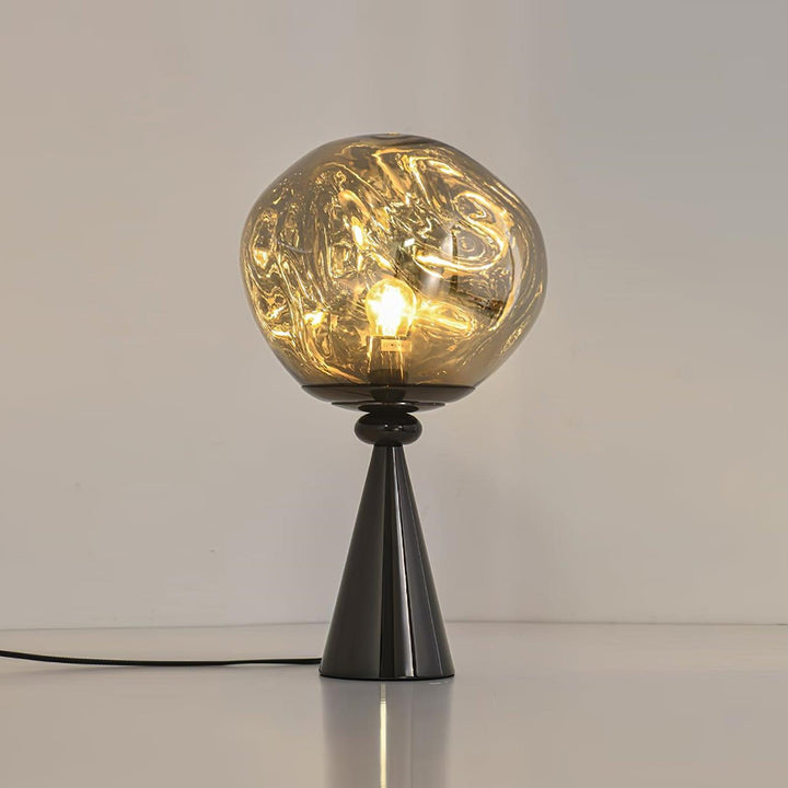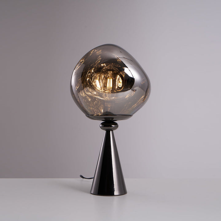Lava Cone Fat Table Lamp illuminates your space with mesmerizing brilliance. Half-metallised glass creates an extraordinary optic effect, casting an ethereal luminosity that is both translucent when on and mirror-finish when off. Its beautifully distorted design resembles the captivating effect of molten glass, creating a stunning and unique ambiance in any room.