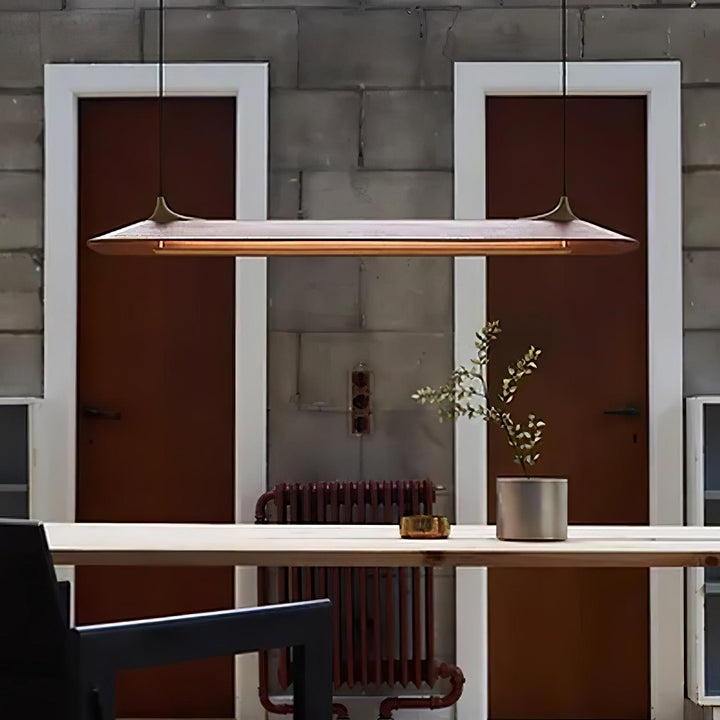 The Mernoe Wooden Chandelier is crafted from a single piece of wood cut to preserve its natural grain and treated with beeswax for a luxurious finish. Its lampshade is further ground and treated for a sharp and robust texture. The fittings are milled from solid brass and then sanded and polished to create a complementary reflection of the wood. This handcrafted piece ensures a distinguished and timeless look to any room.