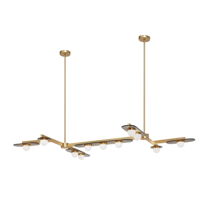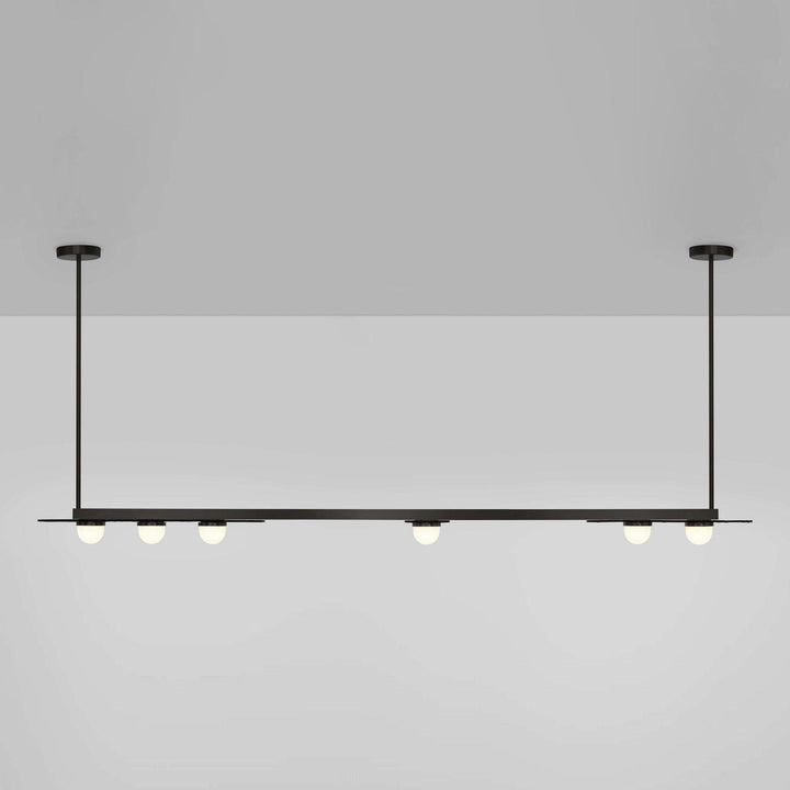 The modulo is a collection of chandelier and wall lights distinguished by its modular form, arranged in linear configurations creating versatile lighting sculptures. Combining functionality with artisanal skill, the design focuses on geometric forms, connected in compositions of modules. The glowing domes are spaced in a linear pattern, allowing the light to reflect along the transparent, elongated glass disc and metal frame.