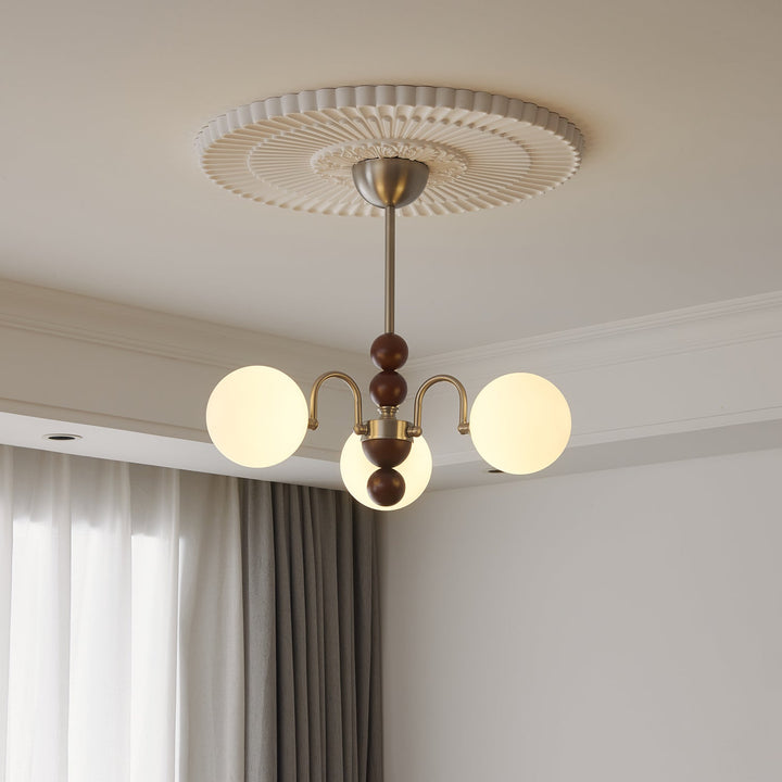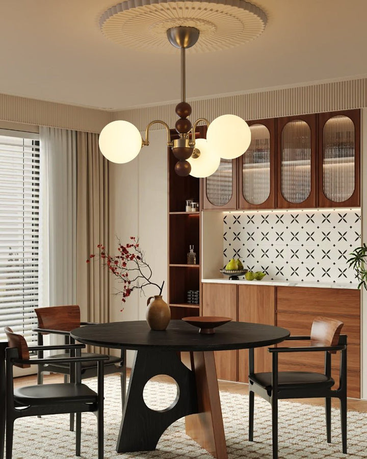The Orbital Curve Chandelier by Vakkerlight showcases gracefully arched metal arms adorned with spherical frosted glass shades. Accented with warm walnut details, this chandelier creates a balanced and inviting ambiance. Elevate your interiors with Vakkerlight's modern sophistication.