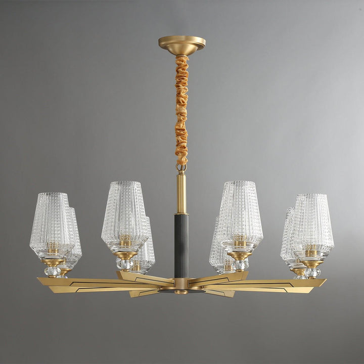 Concentric rings of faceted glass refract light inward and outward. Inspired by 20th century Austrian chandeliers, it pairs ribbed glass with a solid brass frame.The clear glass leaves have a relief on the outside and are shiny on the inside. The chandelier emits a stunning light.