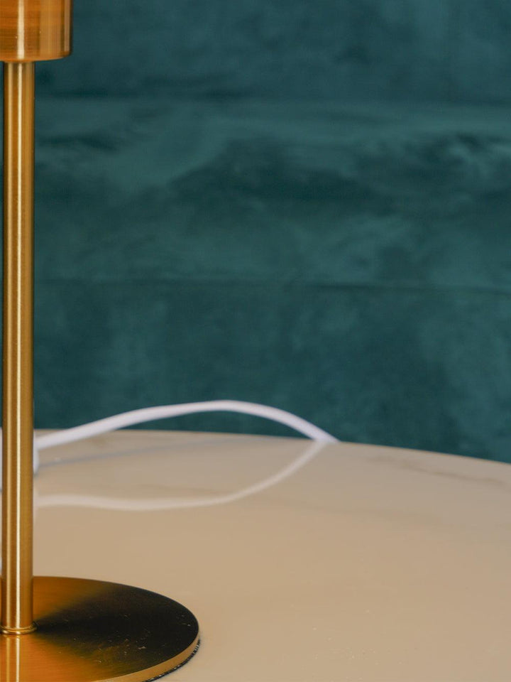 The Perla lamp features a brushed brass base with a Natural off-white shade, giving this lamp a Mid Century Modern appearance. Perfect for your bedside table or a cute element to your shelf.