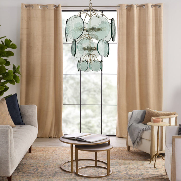 The Rovigo Chandelier features a wrought iron frame paired with recycled glass discs, creating a distinctive flowing design that enhances any space. Its silver leaf finish reflects light beautifully, adding subtle elegance when illuminated. The uniform shapes and clean edges of the glass discs contribute to a contemporary aesthetic, making this chandelier a sophisticated centerpiece for modern interiors.