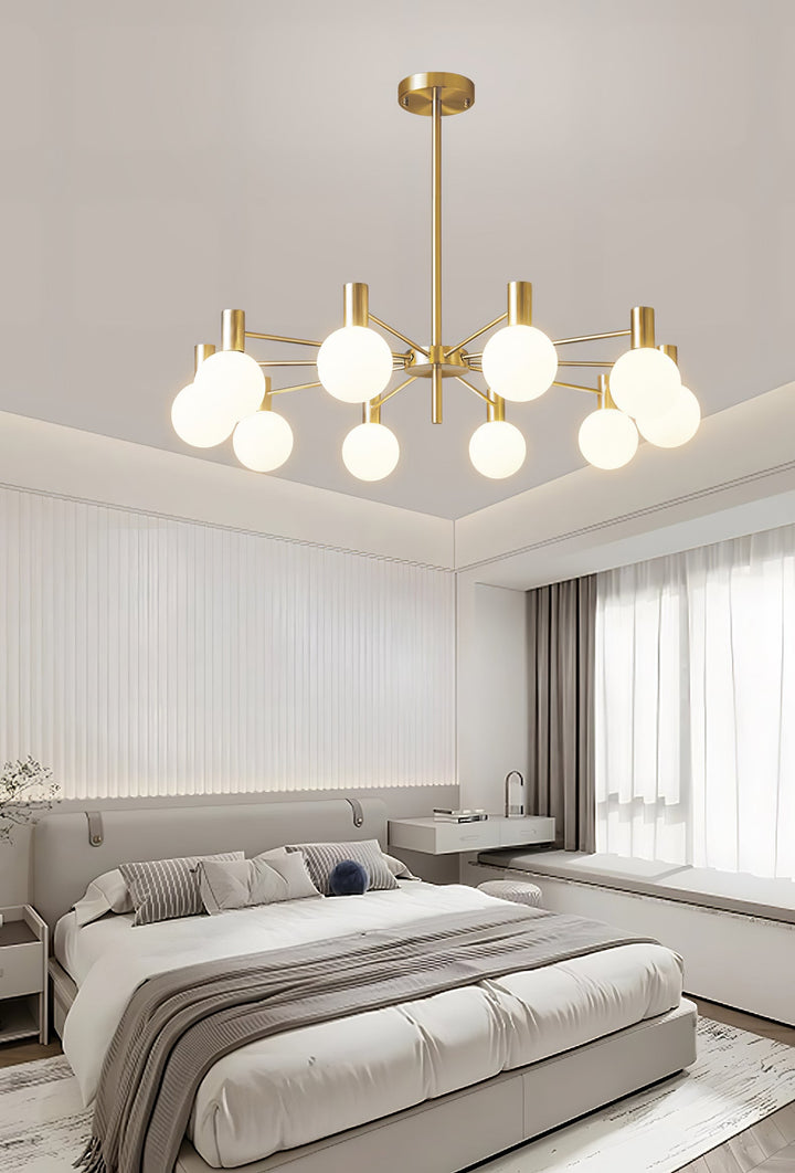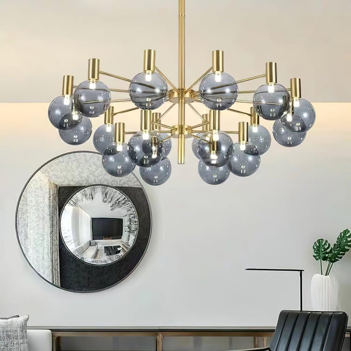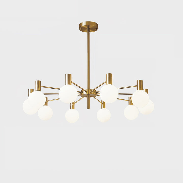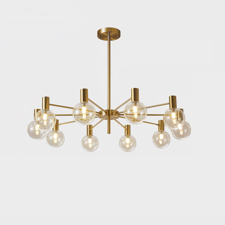 Lit or unlit, the Selva Chandelier radiates elegance and lightness into your lounge or dining room. Its clean-lined base with gold finish gives this lustrous crown a modern look, providing a subtle contrast to the twelve mouth-blown glass lampshades, that were created by skilled artisans. This will surely add an eclectic touch to your home.