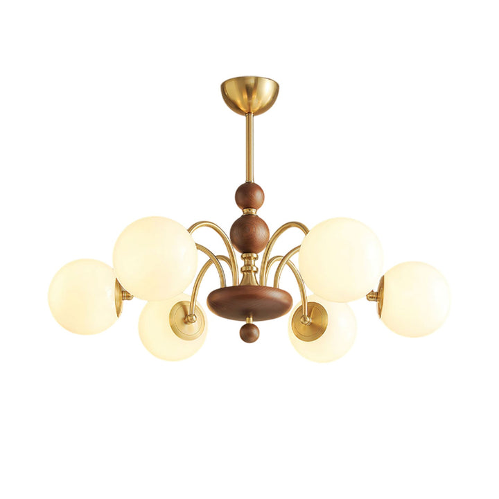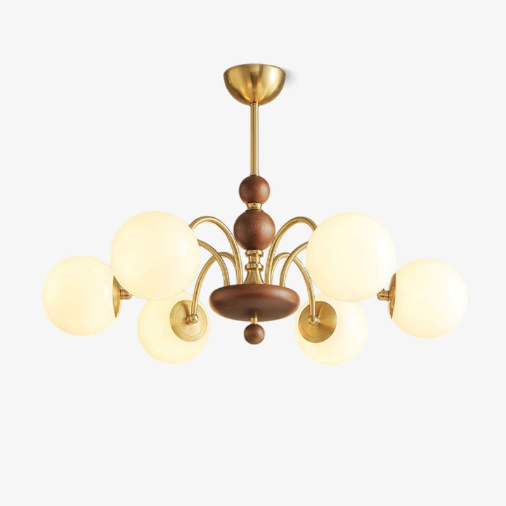 Der Kronleuchter Solara Globe vereint den Charme der Mid-Century-Ära mit einer sanften, organischen Ästhetik. Sein zentraler Holzkern mit Messingakzenten trägt sechs elegant geschwungene Arme, die jeweils eine mattierte Glaskugel halten und ein warmes, stimmungsvolles Licht verbreiten. Das Zusammenspiel von Walnussholz, goldenem Metall und mattem Opalglas schafft eine harmonische Balance von Material und Form.