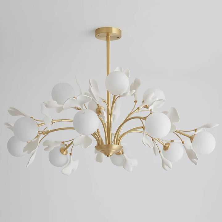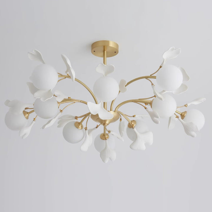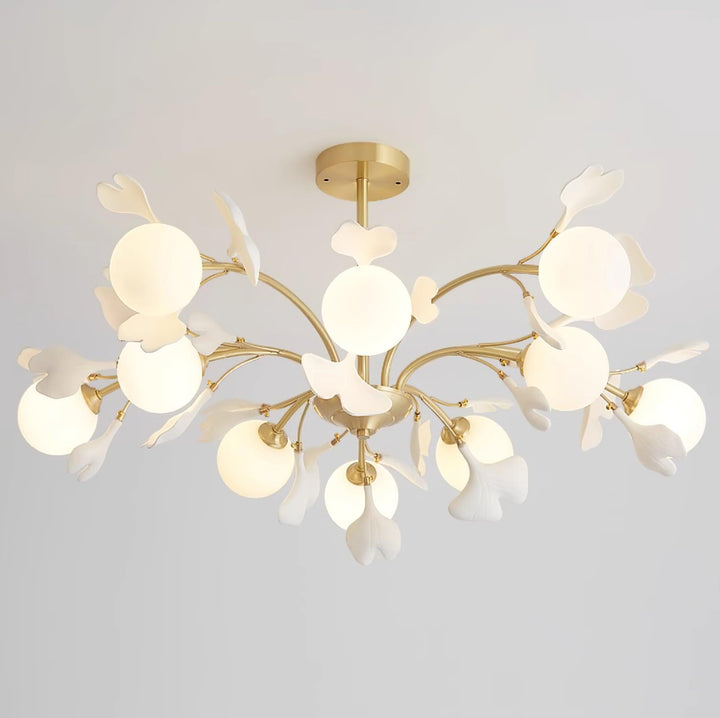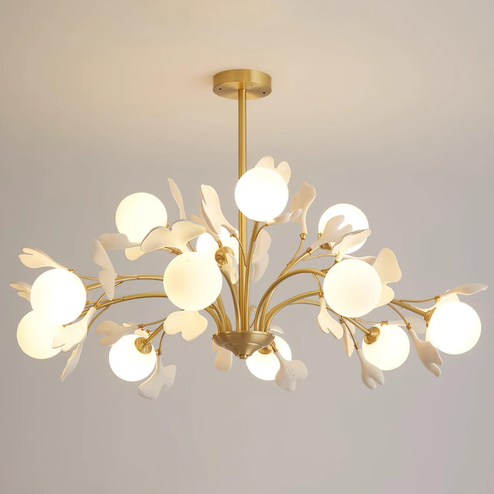 The Thalassa Gingko Chandelier captures the essence of natural beauty and refined elegance. Inspired by the iconic gingko leaf, this chandelier is a celebration of organic forms and luxurious materials. The delicately crafted ceramic leaves frame glowing glass orbs, creating a stunning contrast against the warm brass accents. Perfect for those seeking a statement piece, the Thalassa Gingko Chandelier adds a touch of sophistication to any space, from dining rooms to grand living areas. With its blend of nature-inspired design and modern luxury, this chandelier brings both light and beauty into your home.