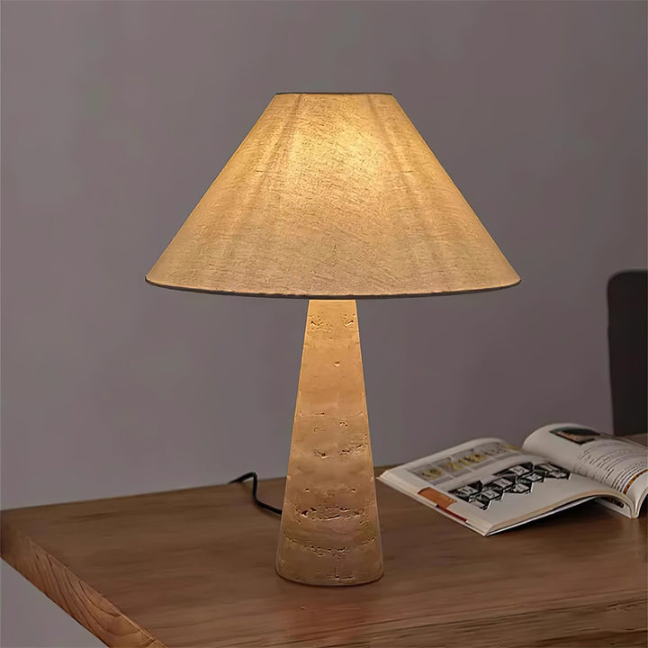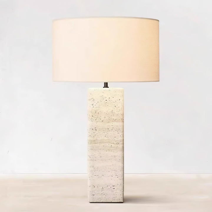 Diese Tischleuchte besticht durch ihren hohen, zylindrischen Travertinfuß mit seiner natürlichen, vielschichtigen Textur, die zeitlose Natürlichkeit ausstrahlt. Darüber sitzt ein weicher, cremefarbener Stoffschirm, der das Licht sanft streut. Im eingeschalteten Zustand erzeugt sie ein warmes, einladendes Licht und verbindet die natürliche Schönheit des Travertins mit einem raffinierten, minimalistischen Design. Sie eignet sich perfekt, um Nachttischen, Schreibtischen oder Wohnzimmerkonsolen eine elegante, von der Natur inspirierte Note zu verleihen.