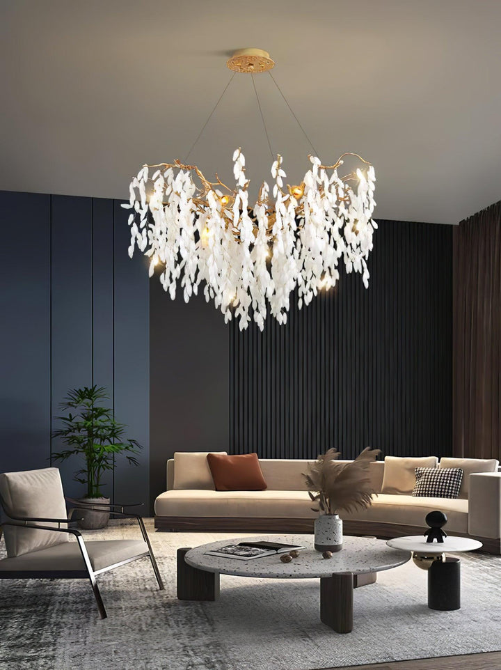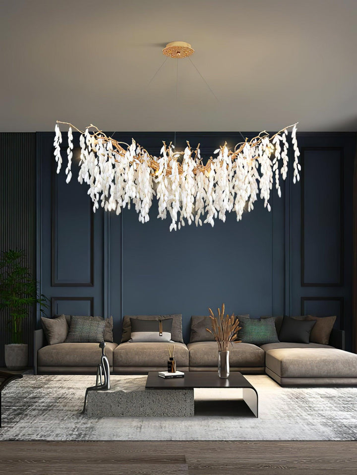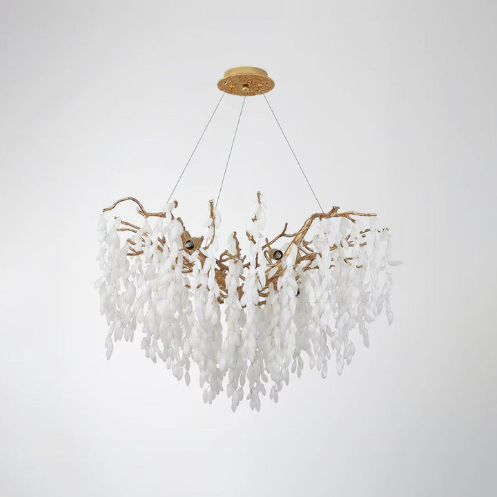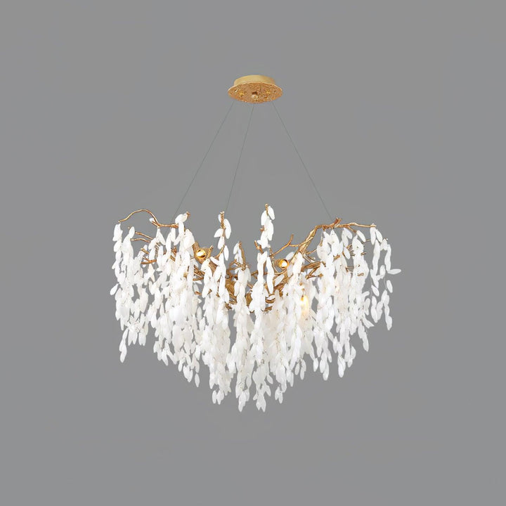 This White Jade Branch Brass Chandelier is finely crafted with layers of white jade and luxurious brass. Its branches resemble softly falling leaves, creating a beautiful and elegant ambience. Perfect for any modern home.