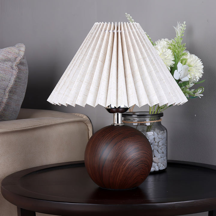 Inspiriert von dänischen Plisseelampen der 70er-Jahre. Diese Lampe besticht durch ihren Holzkorpus mit plissiertem Lampenschirm und einem runden Massivholzfuß. Bereichern Sie Ihr Wohnzimmer oder Nachttisch mit dieser einzigartigen Lampe im Vintage-Stil.