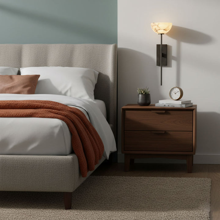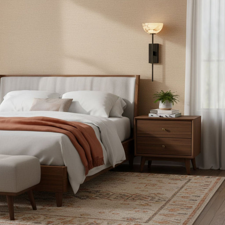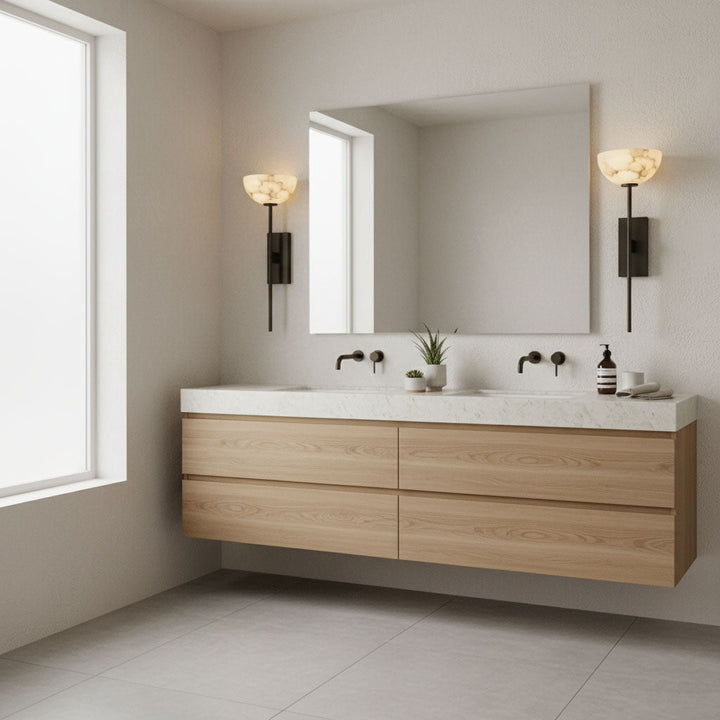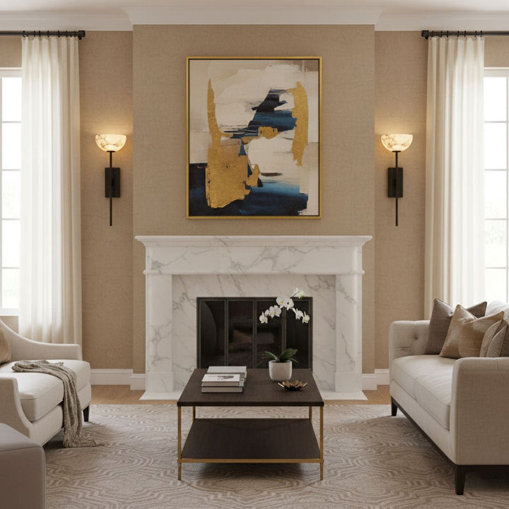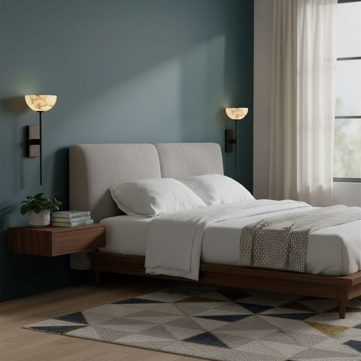 The Alabaster Cup Wall Lamp beautifully captures the serene quality of natural light. Its alabaster shade, paired with a simple brass arm, creates a delicate yet striking visual effect, reminiscent of a tranquil horizon at dusk. Elevate your space with this ethereal addition.