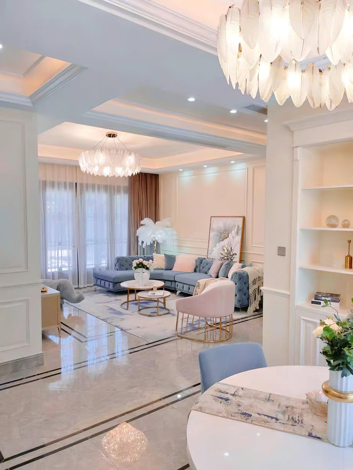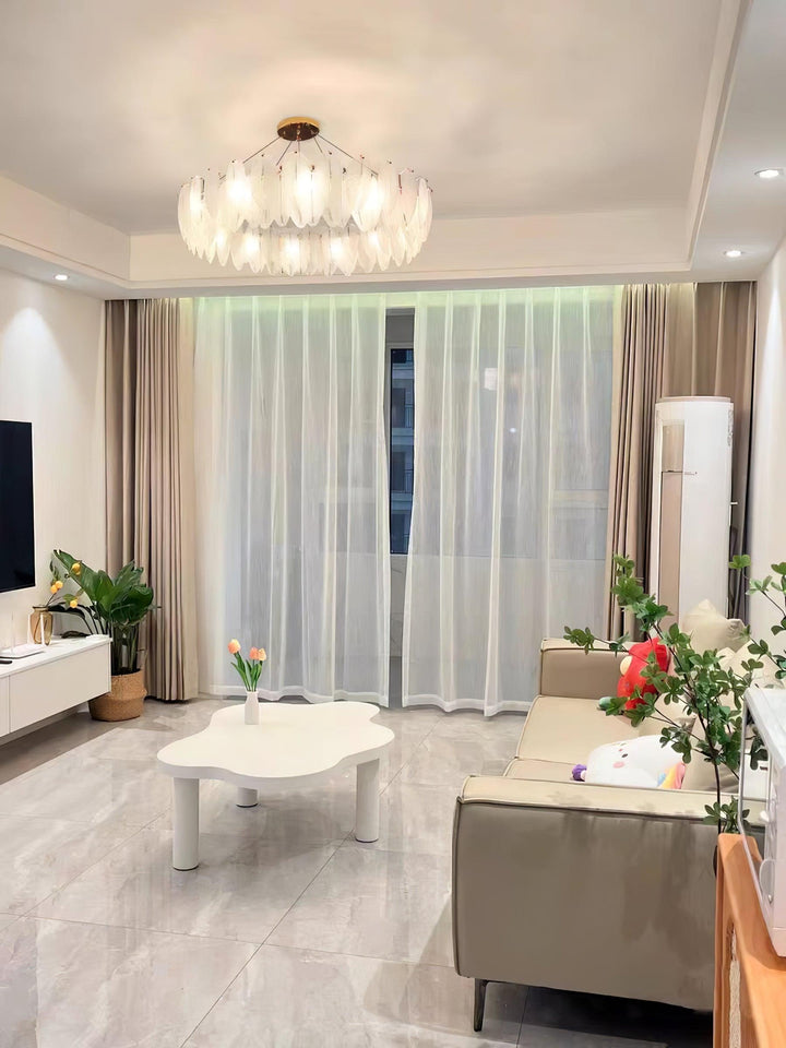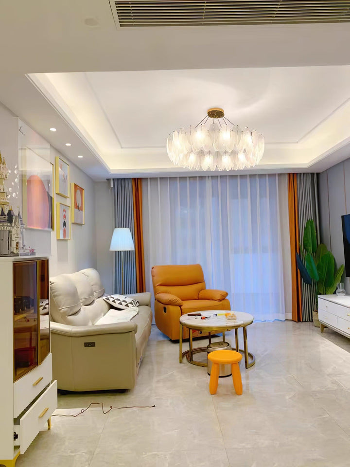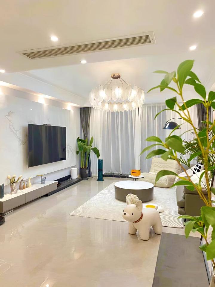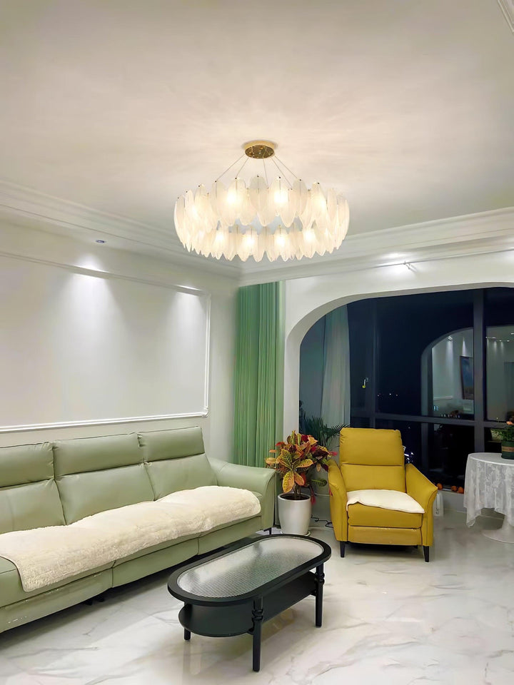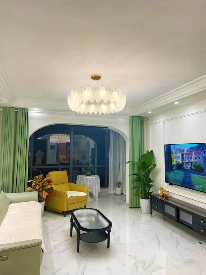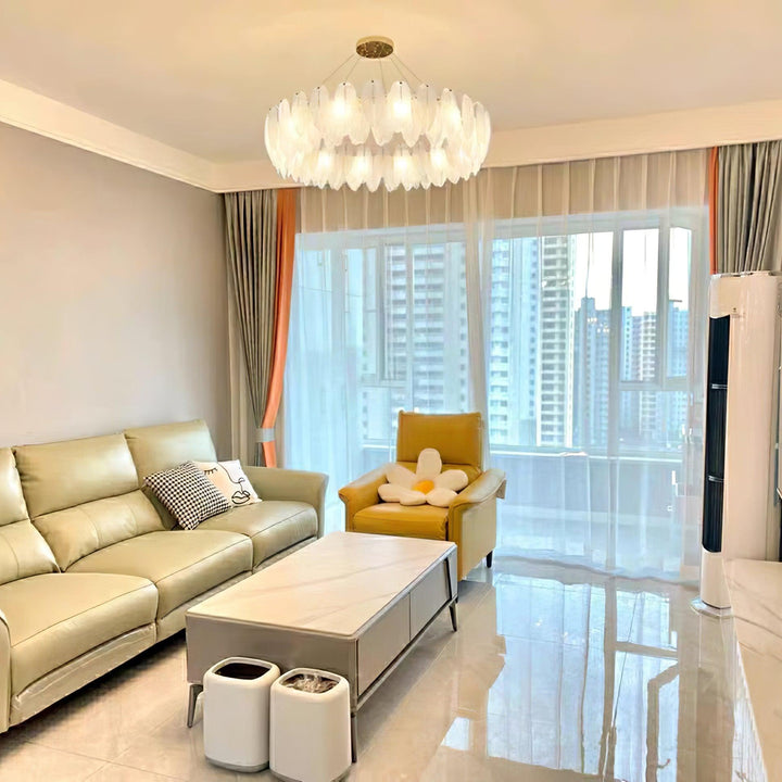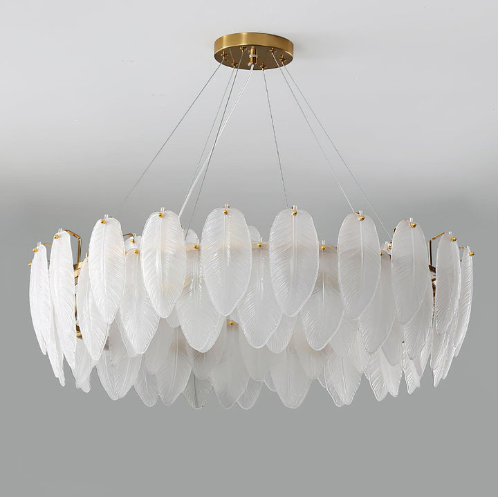 This charming round multi-tier frosted glass feather pendant light managed to combine practicality with elegance. And the design of this product makes itself overall more postmodern. When lit, lighting diffuses from the round cascading frosted glass feather shade to cast a romantic ambiance. Adjustable cable made this item perfectly fit your house. This pendant light resembles a floating feather cloud, impart great conciseness and elegance to your house.