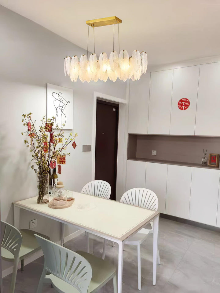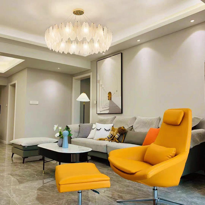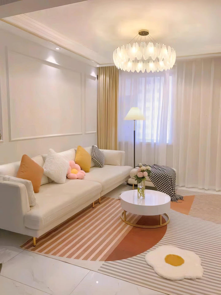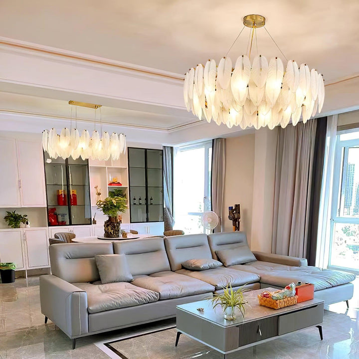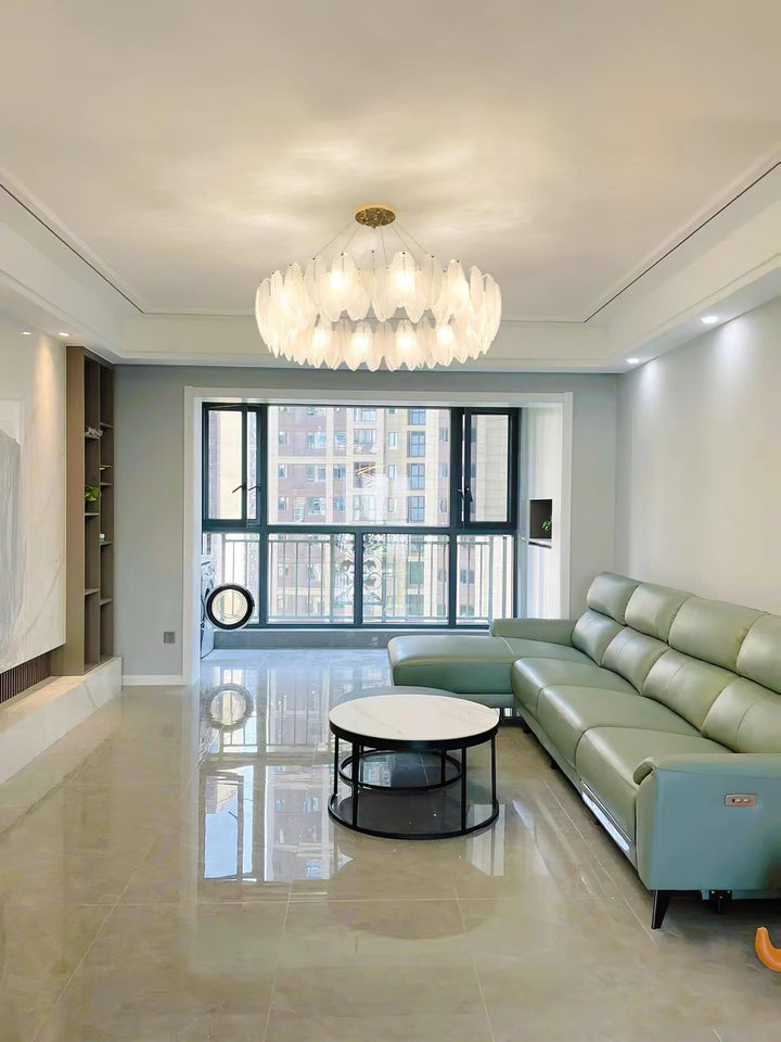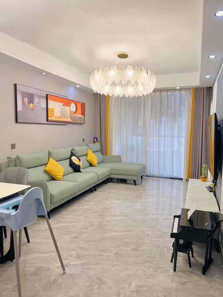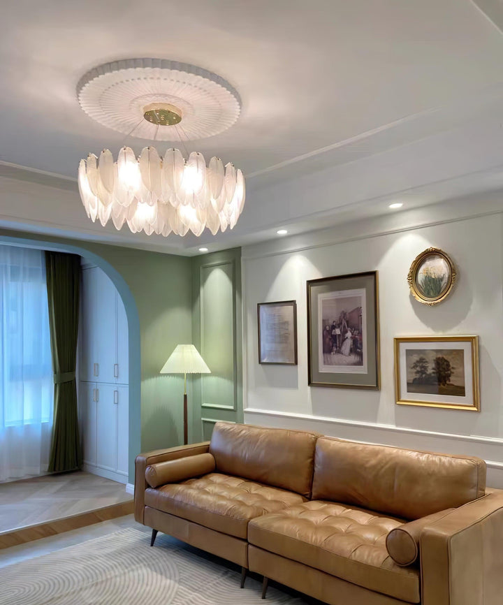 This charming round multi-tier frosted glass feather pendant light managed to combine practicality with elegance. And the design of this product makes itself overall more postmodern. When lit, lighting diffuses from the round cascading frosted glass feather shade to cast a romantic ambiance. Adjustable cable made this item perfectly fit your house. This pendant light resembles a floating feather cloud, impart great conciseness and elegance to your house.