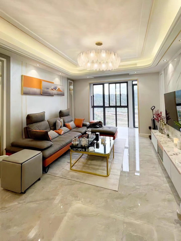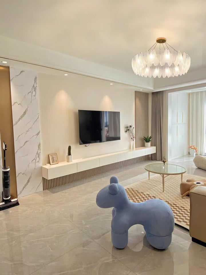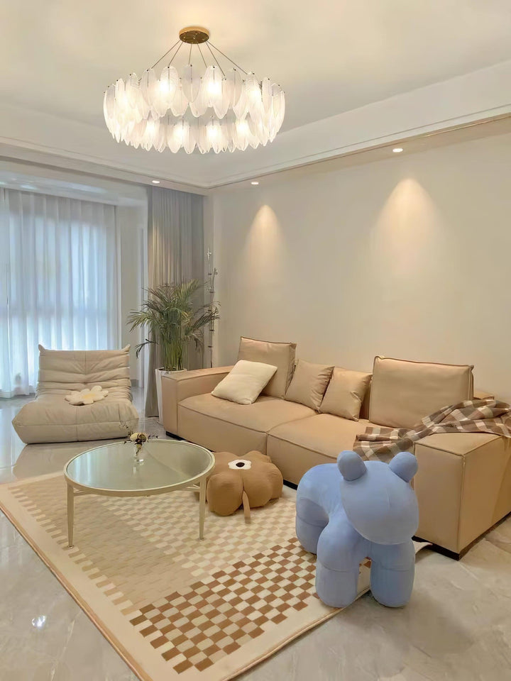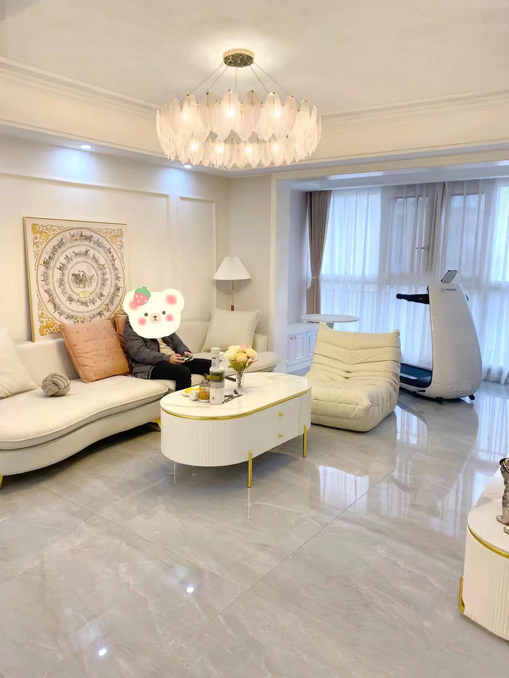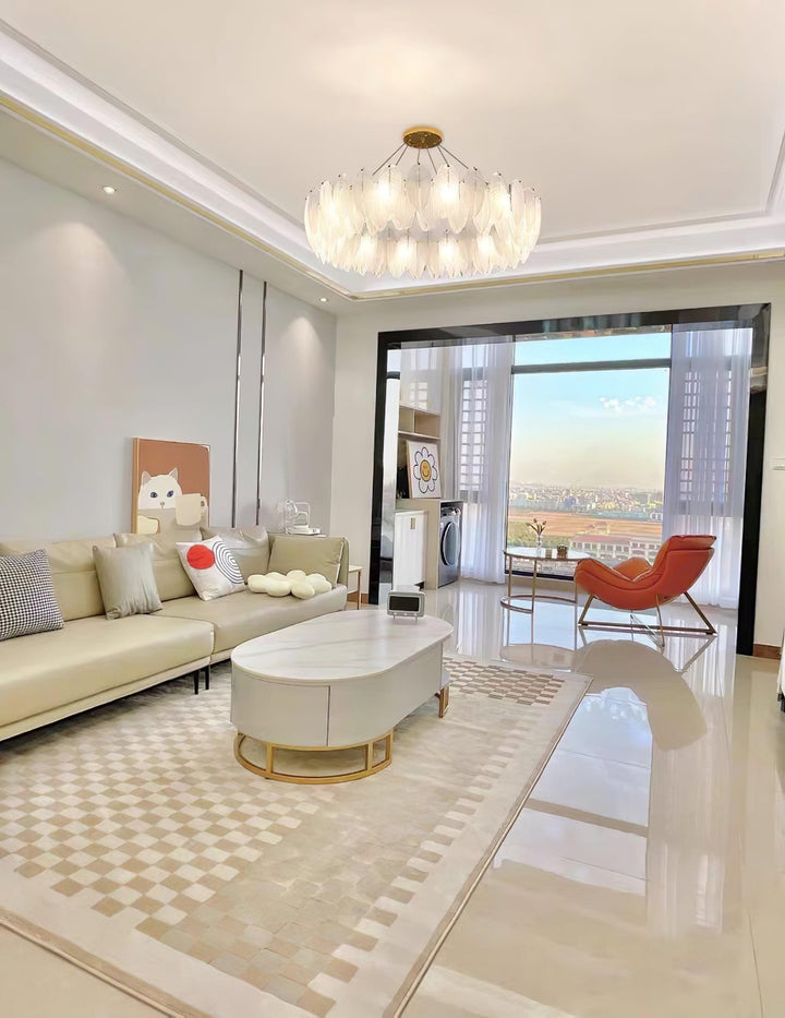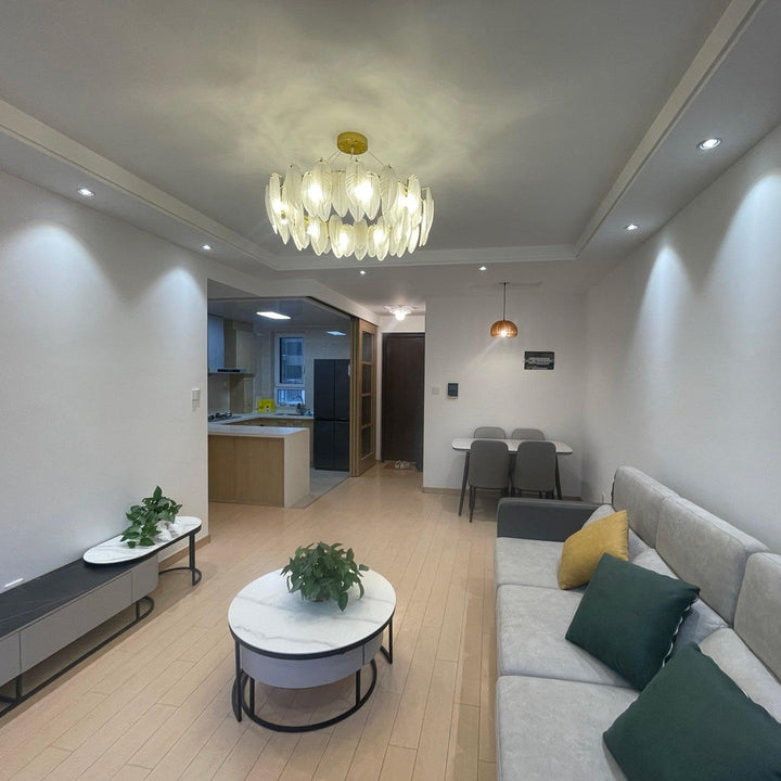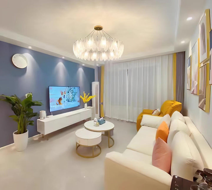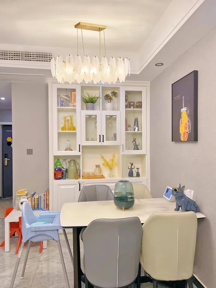 This charming round multi-tier frosted glass feather pendant light managed to combine practicality with elegance. And the design of this product makes itself overall more postmodern. When lit, lighting diffuses from the round cascading frosted glass feather shade to cast a romantic ambiance. Adjustable cable made this item perfectly fit your house. This pendant light resembles a floating feather cloud, impart great conciseness and elegance to your house.
