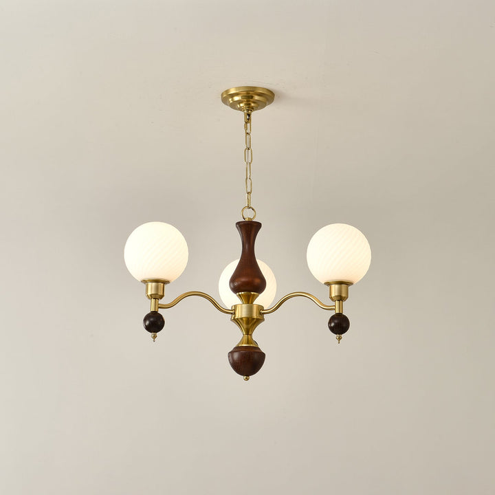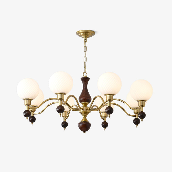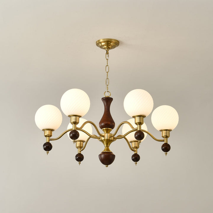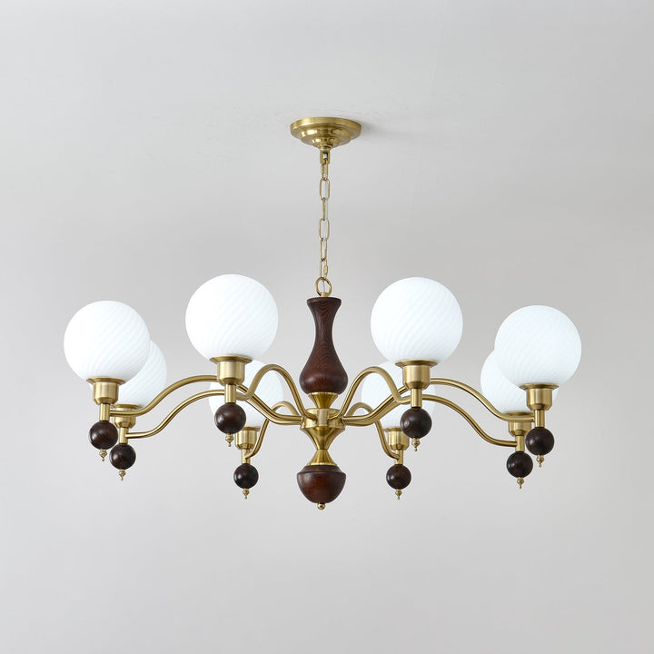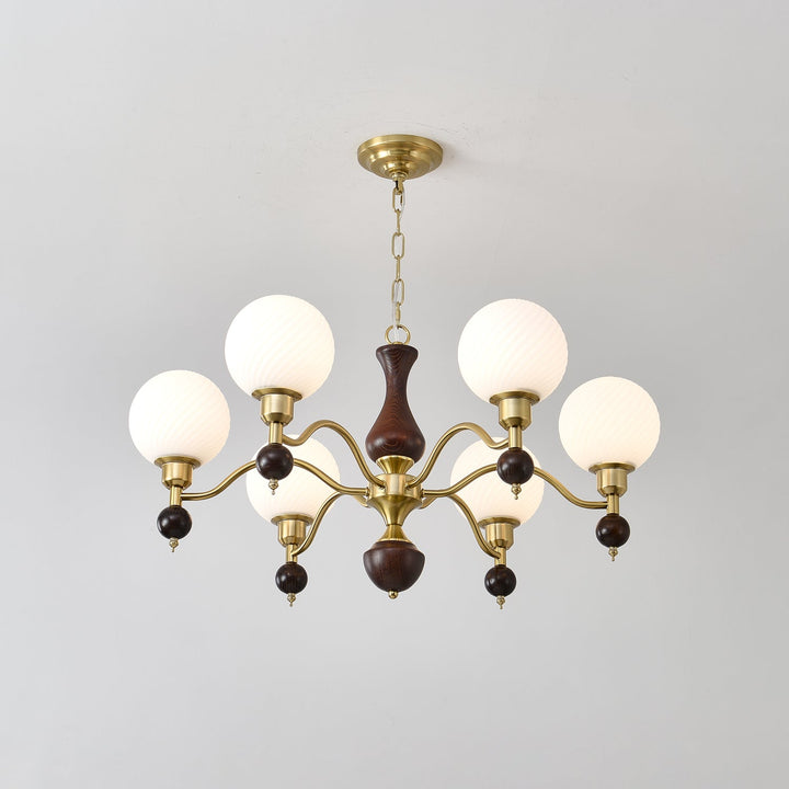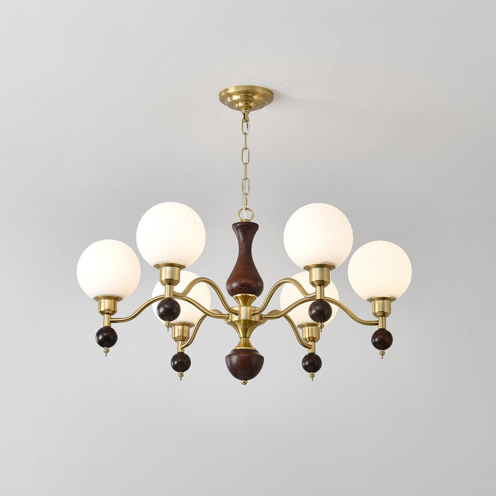 The Globe Orb Walnut Chandelier embodies a harmonious blend of classic elegance and modern sophistication. This chandelier features intricately patterned glass globes that emit a soft, ambient glow, beautifully accentuated by a rich walnut frame and gold detailing. The swirling patterns on the glass enhance its visual appeal, creating a dynamic interplay of light and shadow. Ideal for dining rooms, living areas, or entryways, this chandelier adds a touch of timeless beauty and luxurious warmth to any interior space.