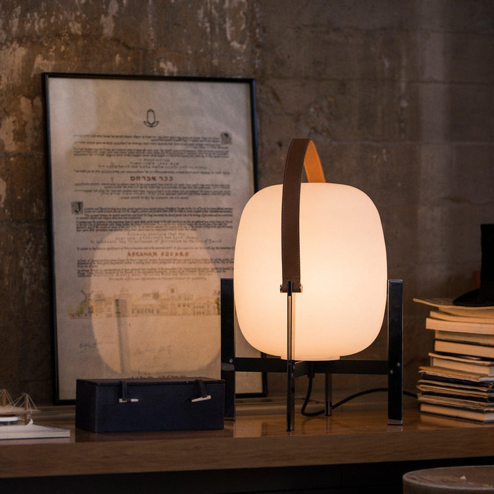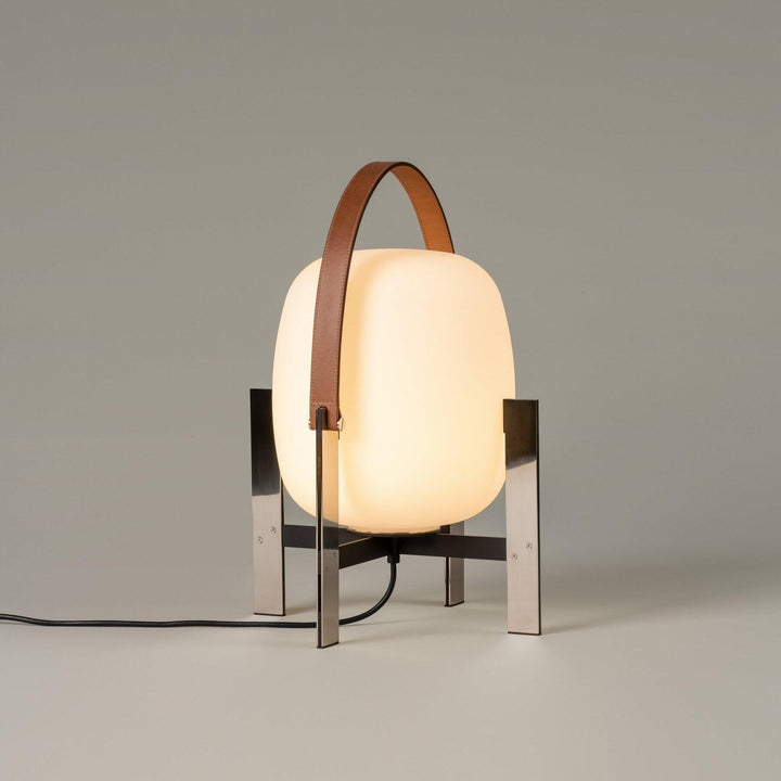 This Portable Lantern Table Lamp is crafted with expert precision, marrying strength and fragility for a unique design. The angles and curves of the steel are contrasted with the soft leather handle, while the delicate opal globe is safely held in place by well-designed brackets.