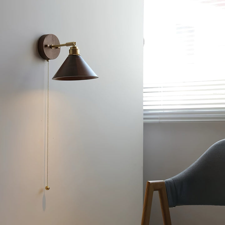 The Rhett Pull Wall Lamp blends industrial charm with warm craftsmanship. Featuring a sleek dome shade with a bronzed exterior and a softly glowing copper-toned interior, it casts a cozy, focused light ideal for bedside reading, studio tasks, or intimate corners. The pull chain adds a nostalgic touch, while the wooden backplate and brass detailing bring a refined sense of balance.
