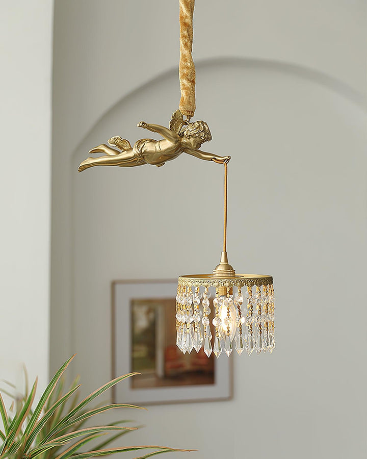 This antique pendnat features a baroque flying angel suspended from a chain, with crystal and brass finishes surrounding the lantern. The light fixtures are intoxicating, delightful, and also spark the viewer’s imagination beyond the confines of the design. This masterpiece is perfect for a bedroom, entryway, living room or dining room.