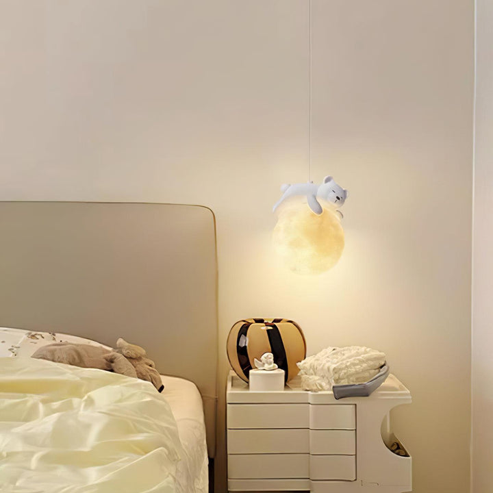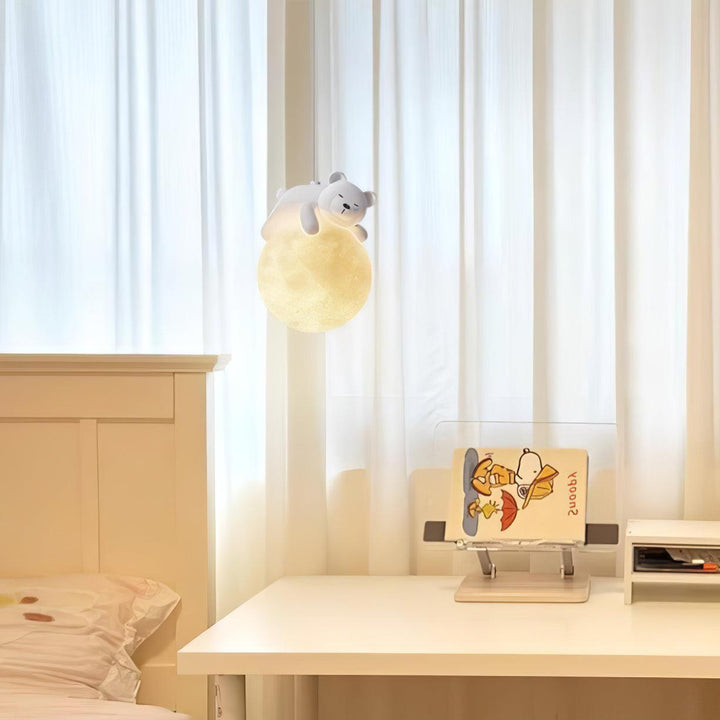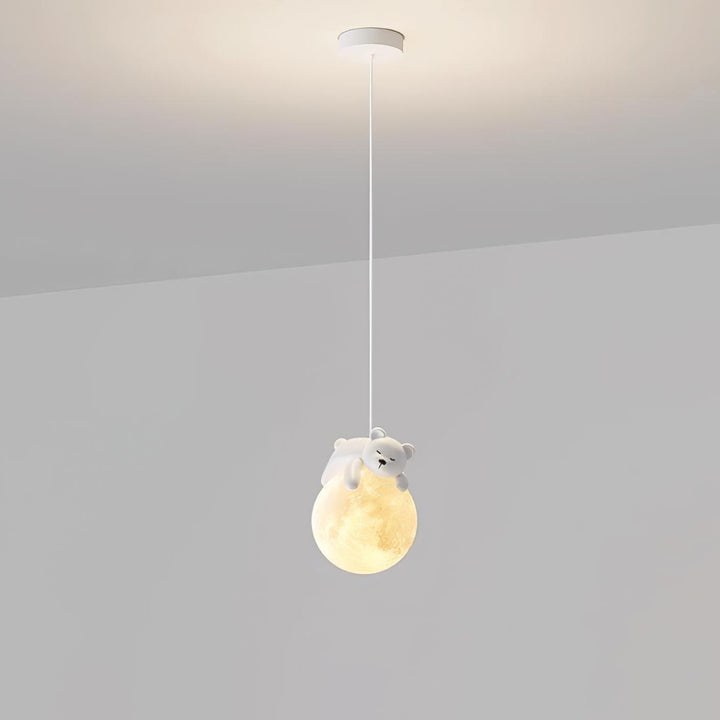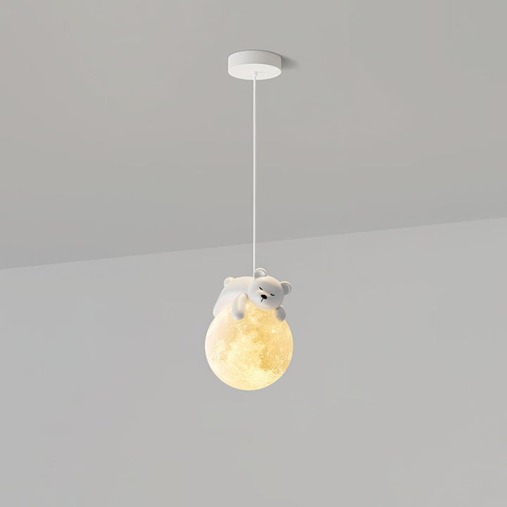 This Animal Sleeping Pendant Lamp will create a warm and cozy atmosphere for any child's bedroom. Its 3D-printed bear and moon design is crafted from durable resin and iron, making it an attractive and long-lasting light fixture. Illuminate any room with this one-of-a-kind piece.