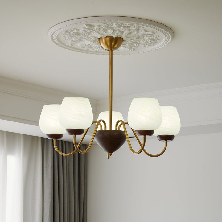 The Aurorium Chandelier stands out with its luminous globe shades and gracefully arched brass arms. Walnut accents add warmth, making this chandelier a beacon of understated luxury.