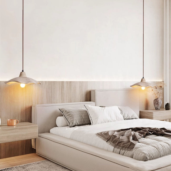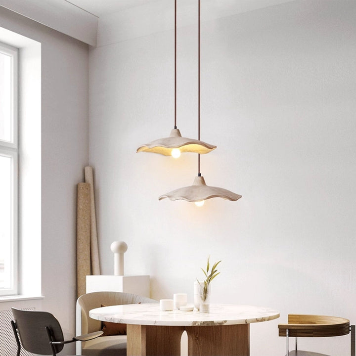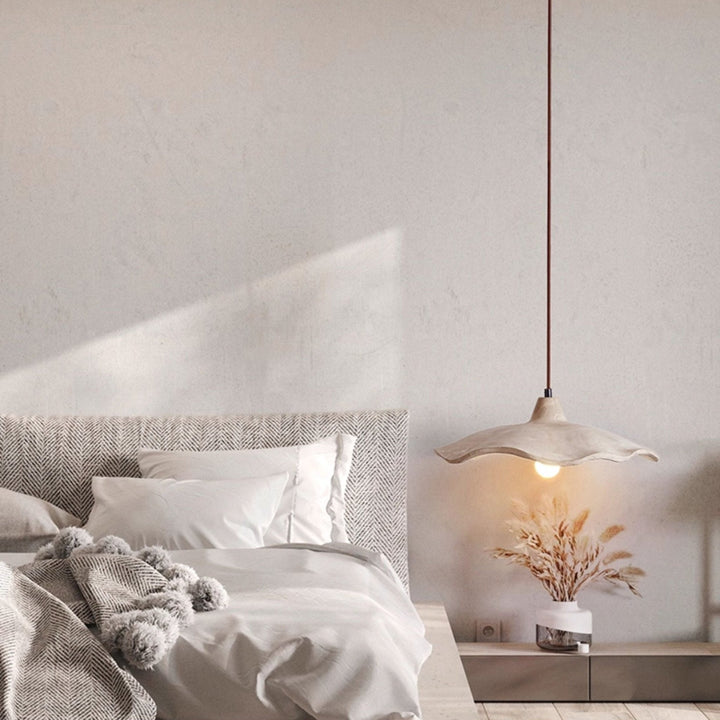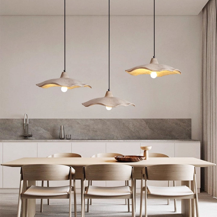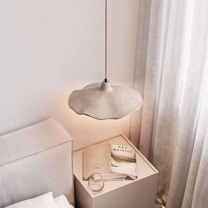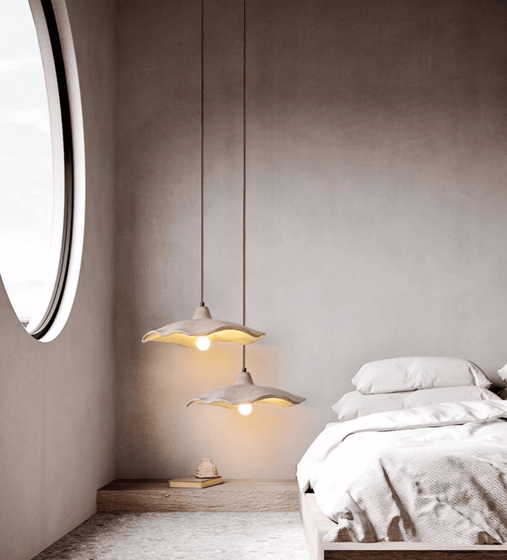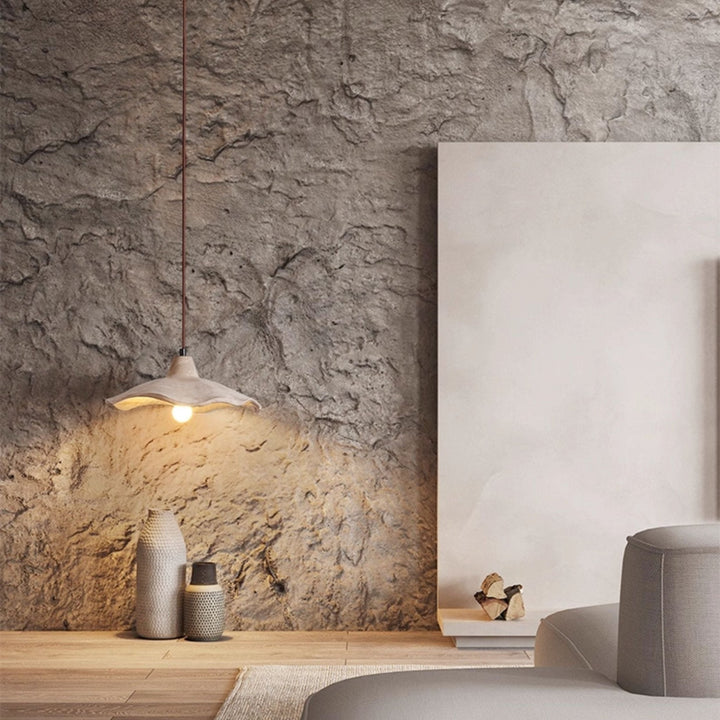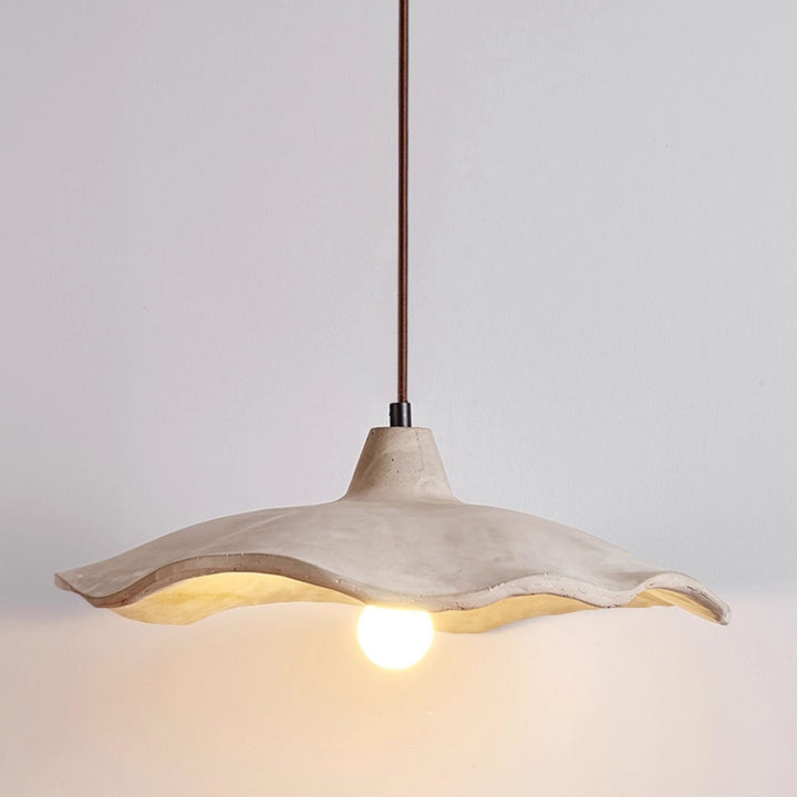 This pendant light features a concrete shade with a petal - like, wavy edge, suspended by a brown cord. When lit, the exposed bulb casts a warm glow that highlights the concrete’s textured surface. Blending industrial - chic concrete with organic, floral - inspired design, it adds a unique, artistic touch to dining areas, kitchen islands, or living spaces.
