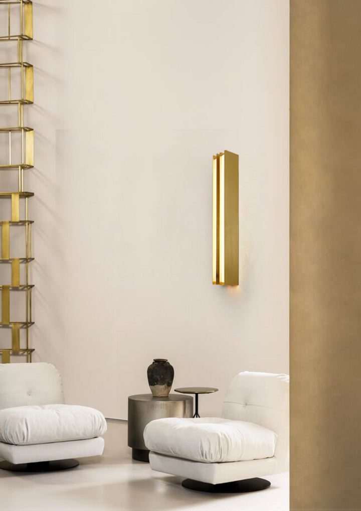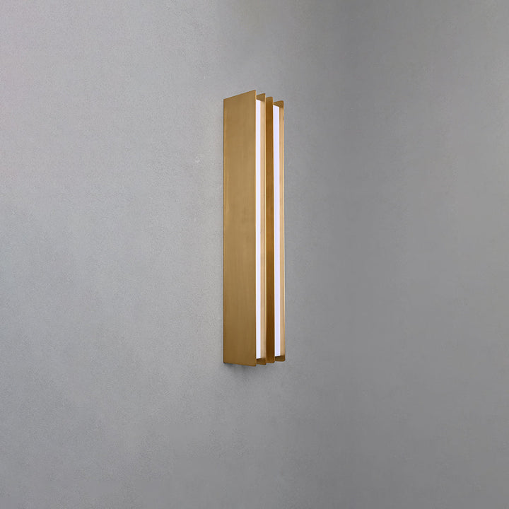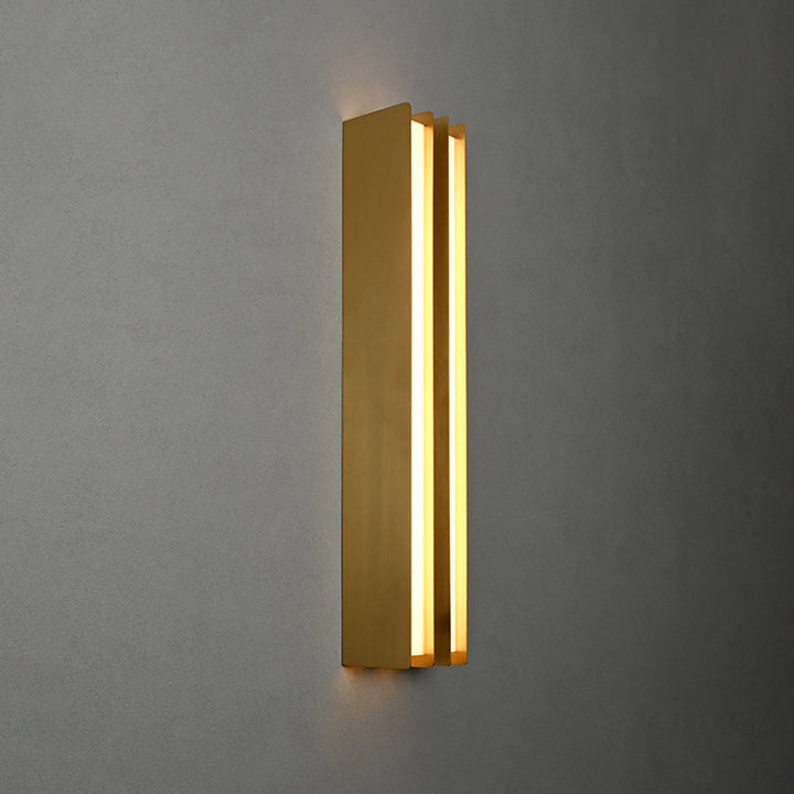 The Vakkerlight Layered Blade Sconce is an exercise in architectural precision and indirect light. This striking vertical fixture is composed of multiple parallel brass or gold-toned metal blades that are subtly offset from one another.