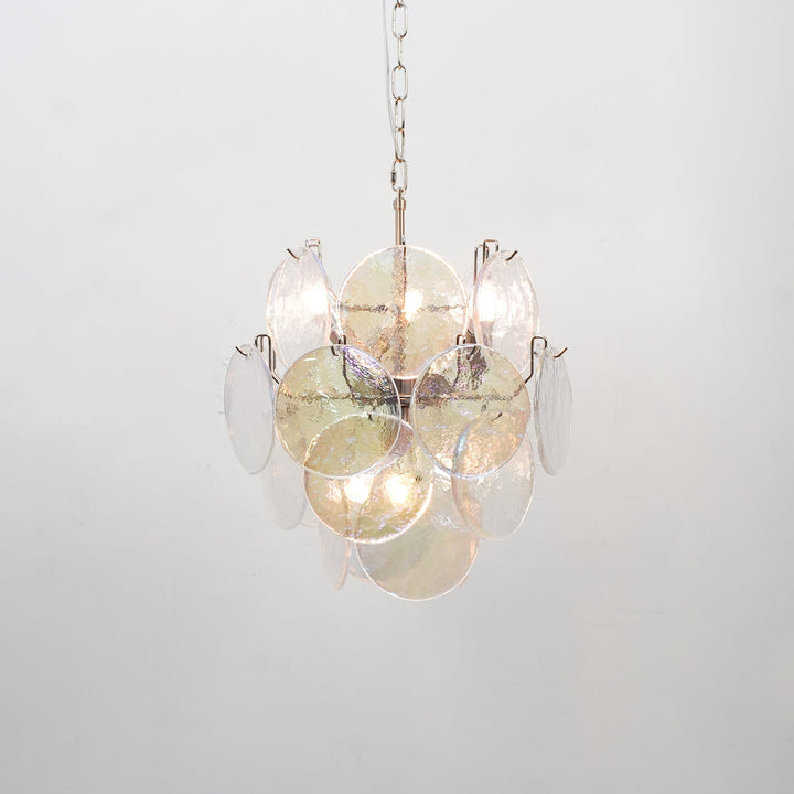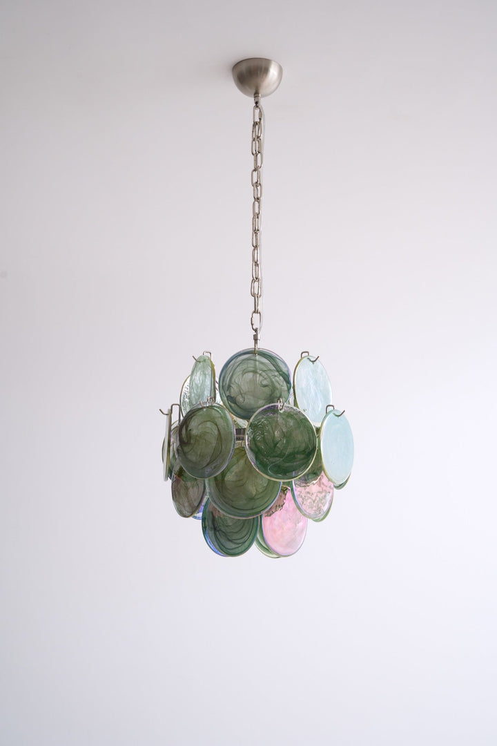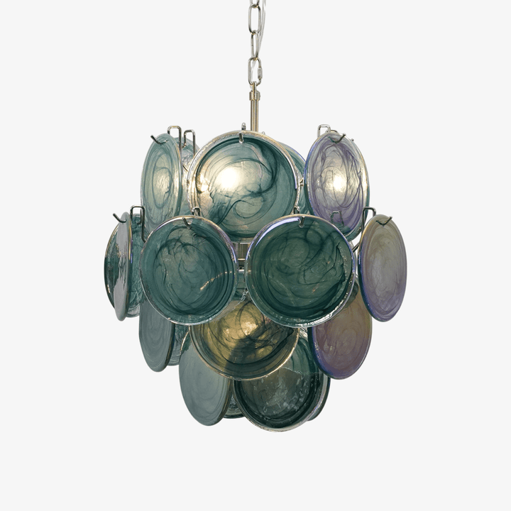 The Lunaria Disc Murano Chandelier is a radiant composition of handcrafted Murano glass, each disc swirling with delicate pigment and organic texture. Suspended in layers from a sleek metal frame, these iridescent forms shimmer and shift with the light—casting a dreamy, kaleidoscopic glow that transforms any room into a gallery of soft color and refined elegance.