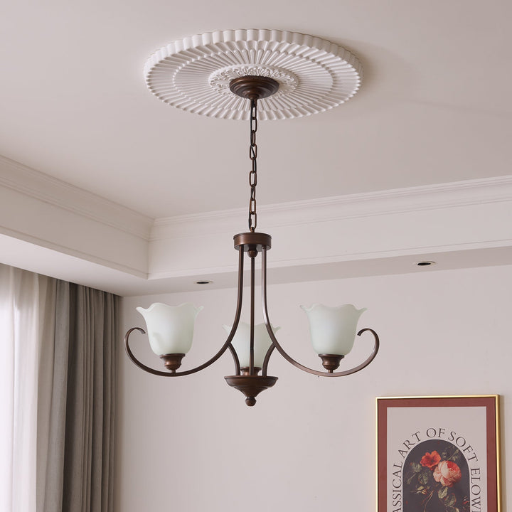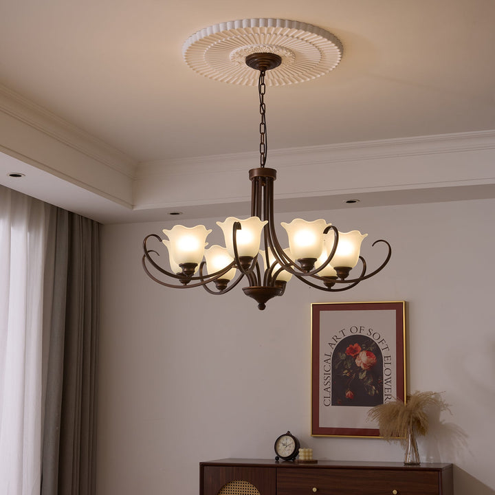 The Mireille Floral Chandelier by Vakkerlight blends vintage-inspired elegance with modern sophistication. Featuring beautifully crafted glass shades in floral designs and graceful bronze arms, this pendant light adds a touch of charm and warmth to any space.