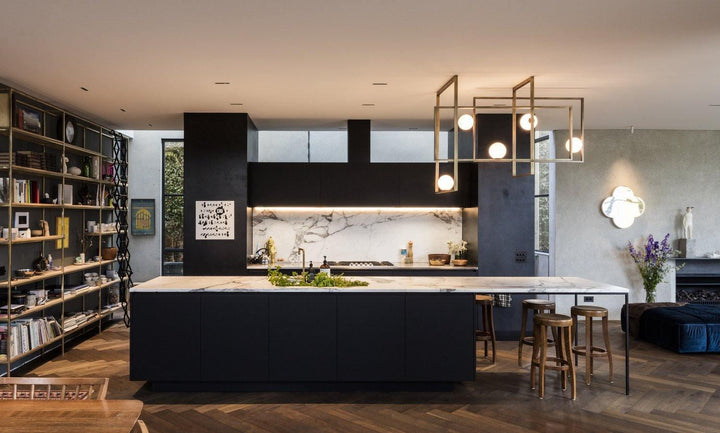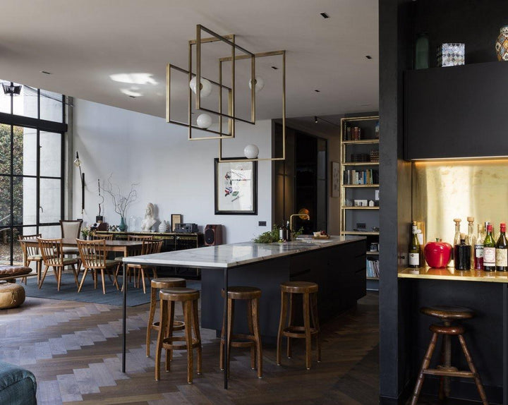Mondrian Glass chandelier features five mouth-blown Murano glass spheres in white, amethyst, or smoke-grey and the metal structure comes in a variety of metallic finishes. For more purist Cubanists the LED version has its light source integrated into the frame so that the striking form is simplified.