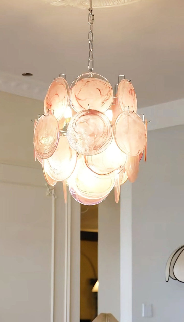Experience vintage charm and sophistication with our Pink Murano Disc Glass Chandelier. Radiating a warm, welcoming glow, this stunning centerpiece adds a touch of elegance to any room. Its vibrant pink color and unique design make for a striking visual appeal, elevating your home decor to a whole new level.