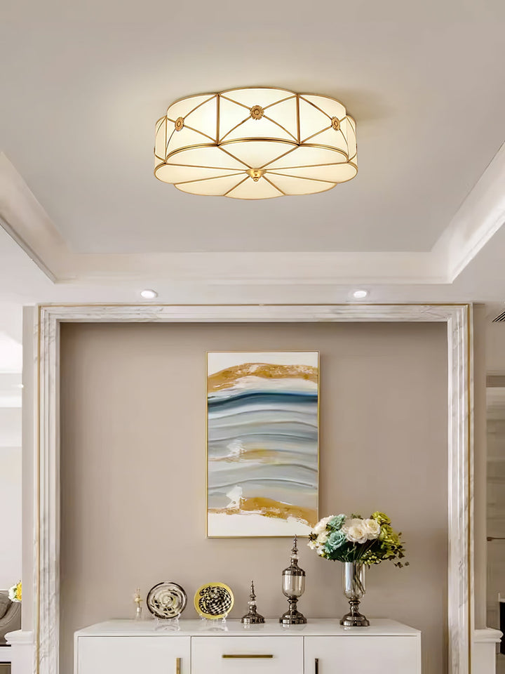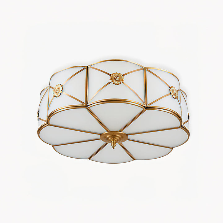 This classic scalloped edge brass flush mount light is perfect for adding a warm, welcoming atmosphere to your living room. The unique style is accented with frosted glass and metal accents for an attractive touch. The flush mount design is perfect for those with limited space.