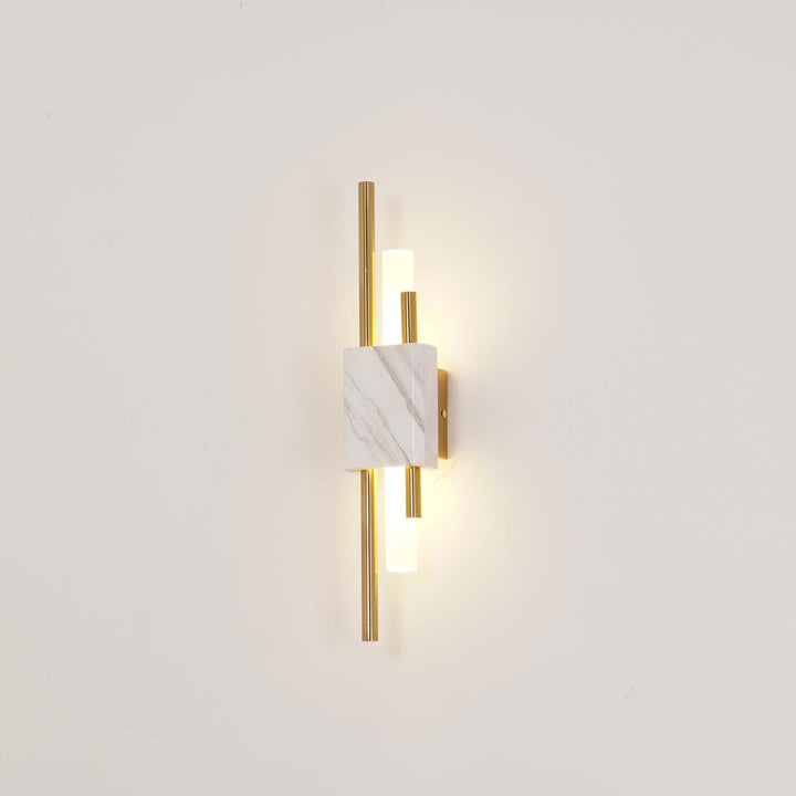 Slimline yet dynamic, the Tanto Wall Light combines two asymmetric brass rods and a central cylindrical opal lamp. Connected together by a marble front it makes quite the stylish statement on any wall.