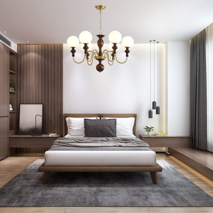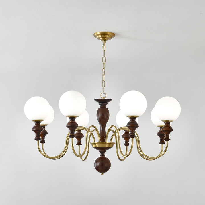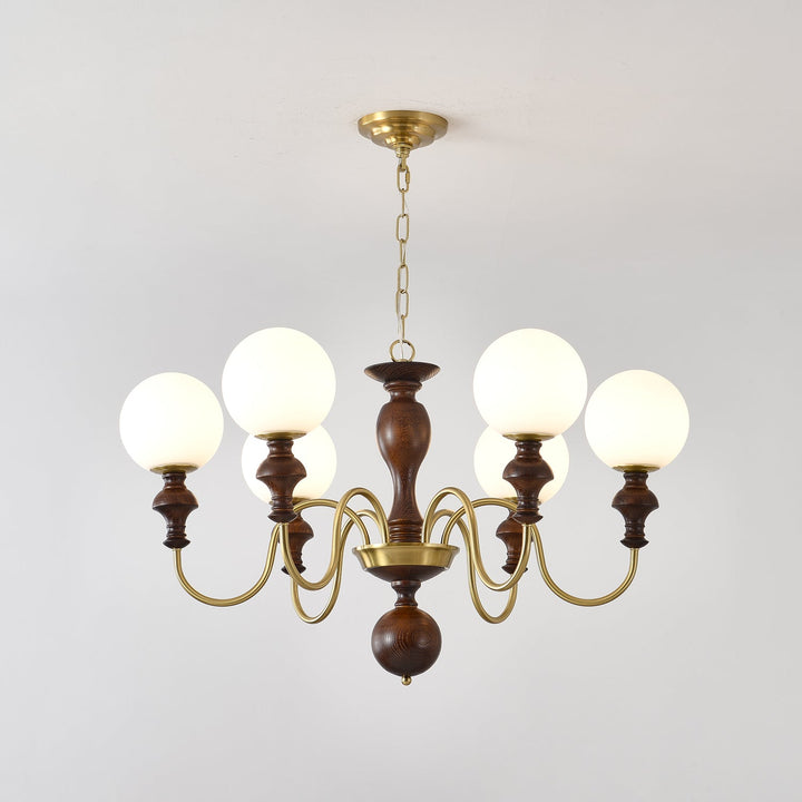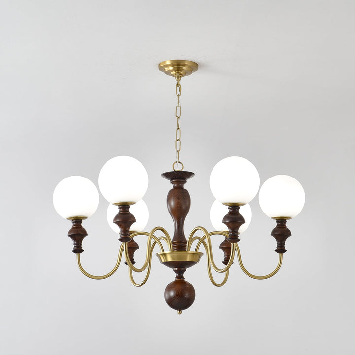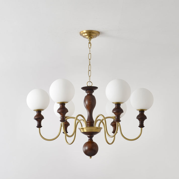 Inspired by the perfect harmony of spheres, this chandelier is a modern take on a classic design. The round globes symbolize completeness and balance, paired with wood and brass accents that create a timeless elegance. This piece seamlessly blends into both contemporary and traditional interiors, offering a soft, ambient light that transforms any space into a cozy retreat.