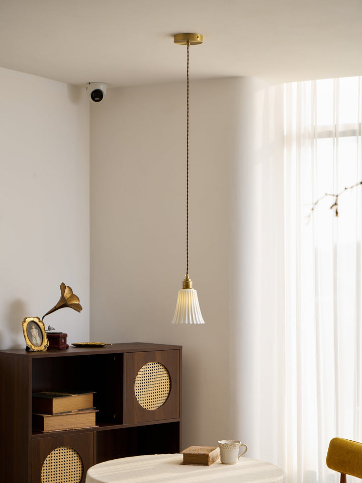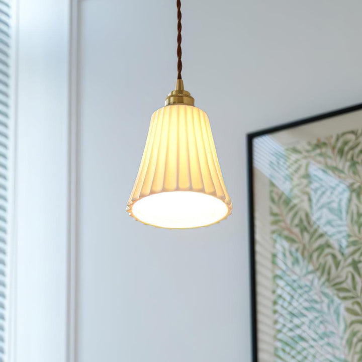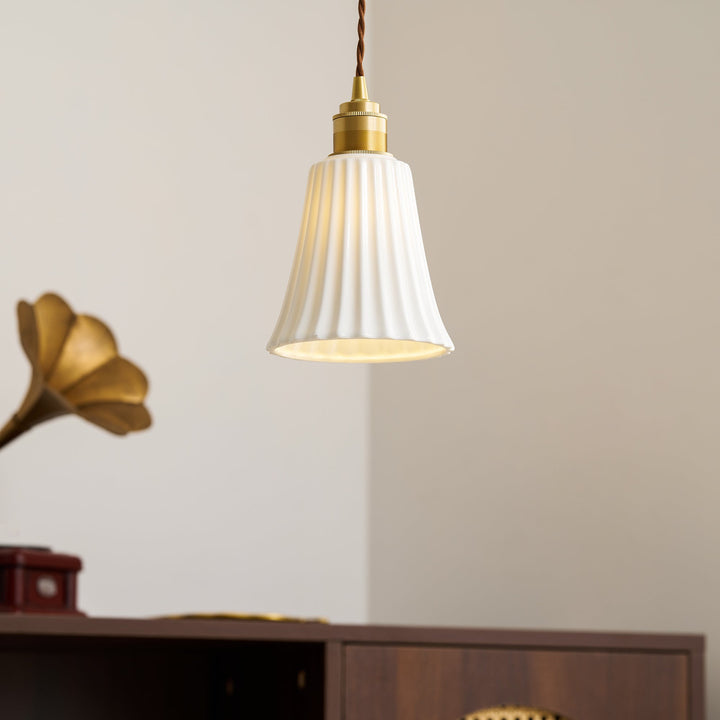 The Trumpet Ceramic Pendant Light features a mid-century Chinese inspired ceramic design. The traditional hundred pleats trumpet shape provides a unique accent to any space. Perfect for anyone looking for a stunning lighting fixture that stands out.